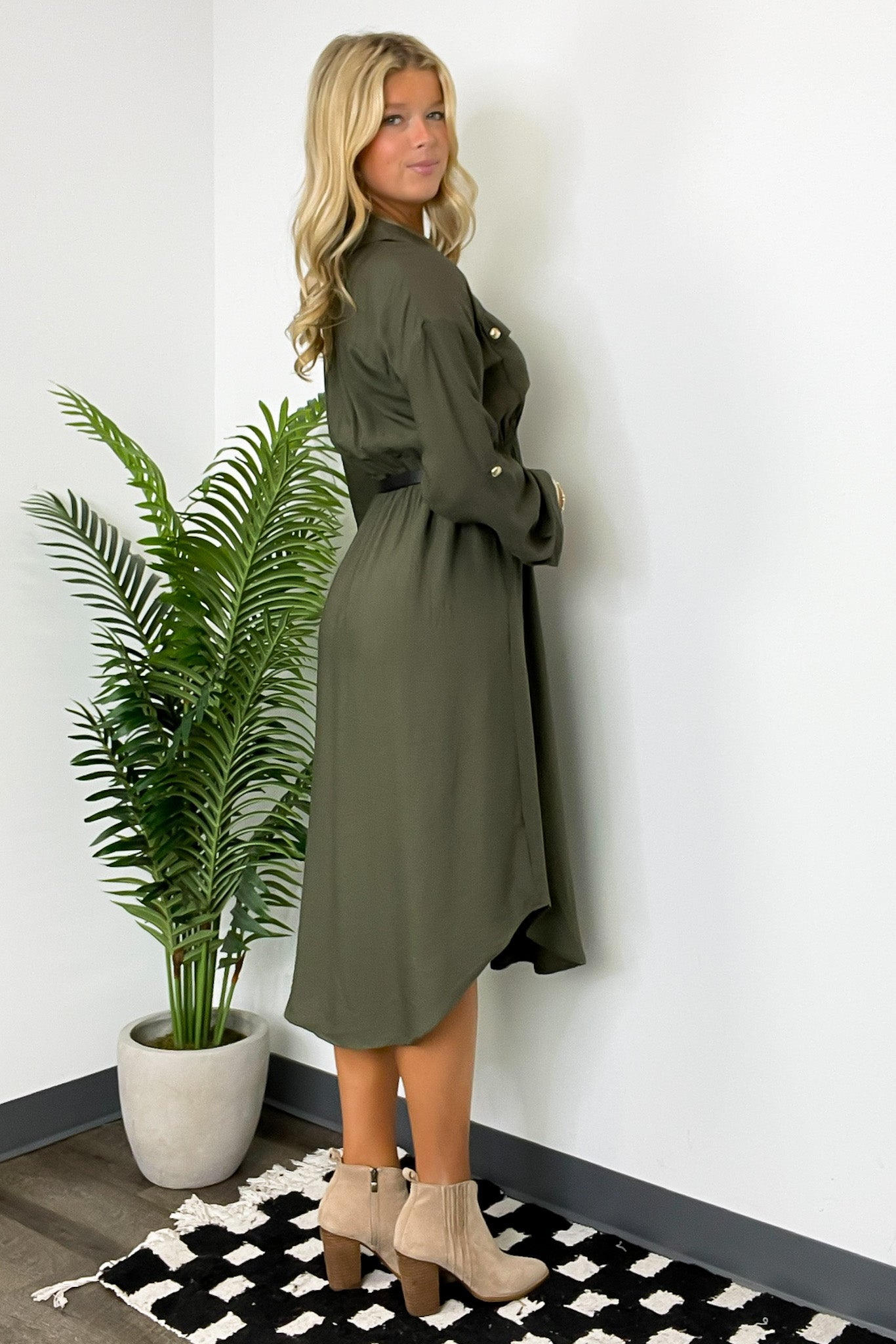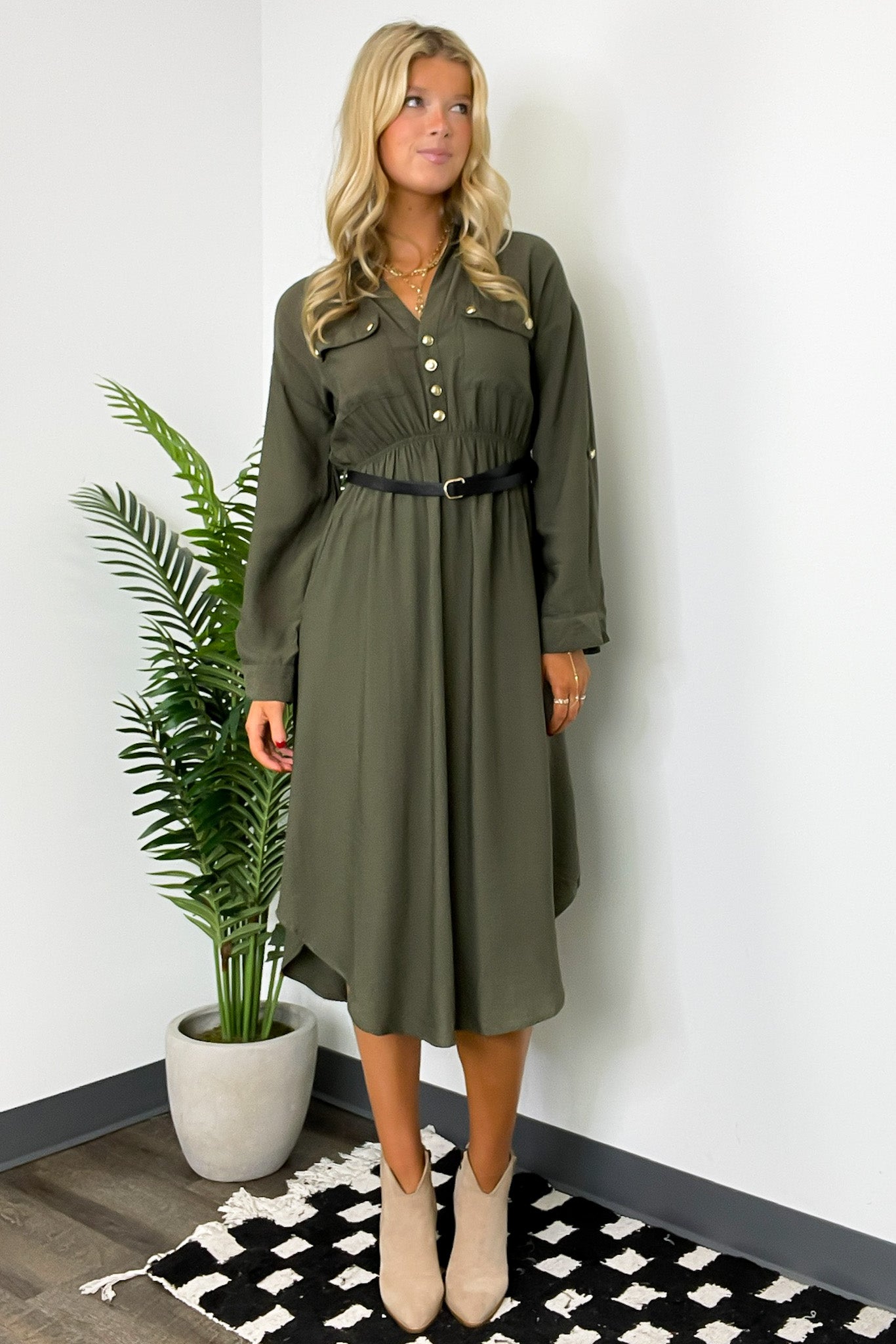 Details: Be the trendsetter with the Adeline Button Down Belted Midi Dress. Featuring a collared neckline, half button placket, and 3/4 sleeves, this dress is effortlessly chic. The belted waist accentuates your figure and adds a touch of sophistication.