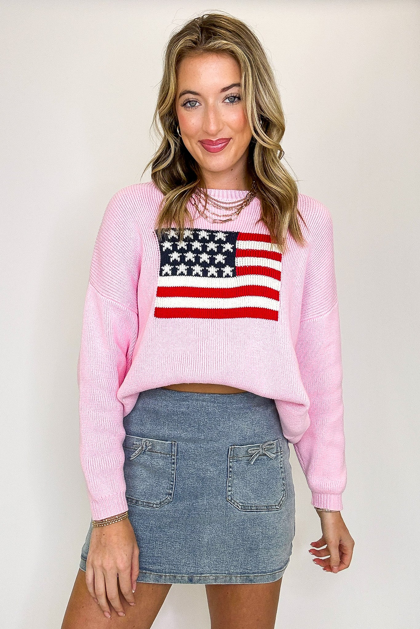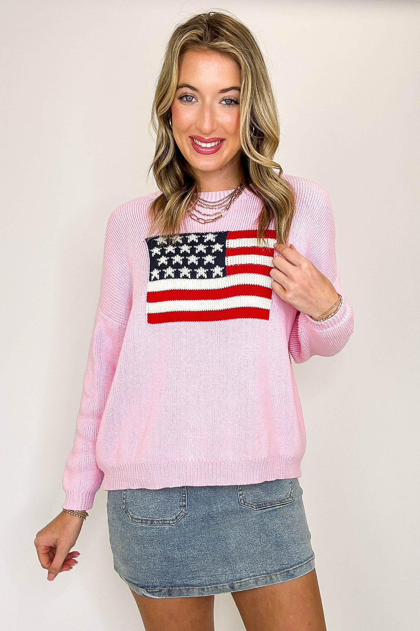 Details: Celebrate your patriotic spirit with a soft, sweet twist in the Cotton Candy Liberty Sweater. This cozy knit sweater features a playful pink rendition of the classic American flag ― perfect for adding a fresh, feminine vibe to your seasonal wardrobe. Whether you're gearing up for festive summer days or layering into fall, this sweater blends comfort and style effortlessly.
