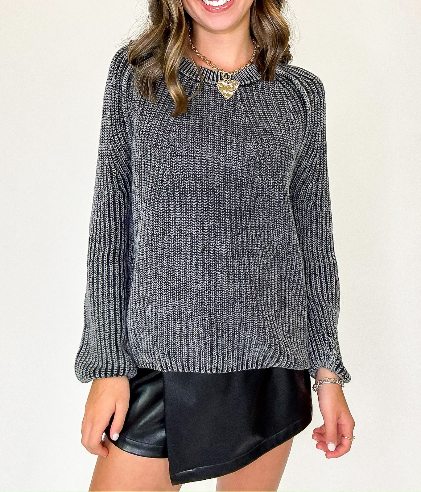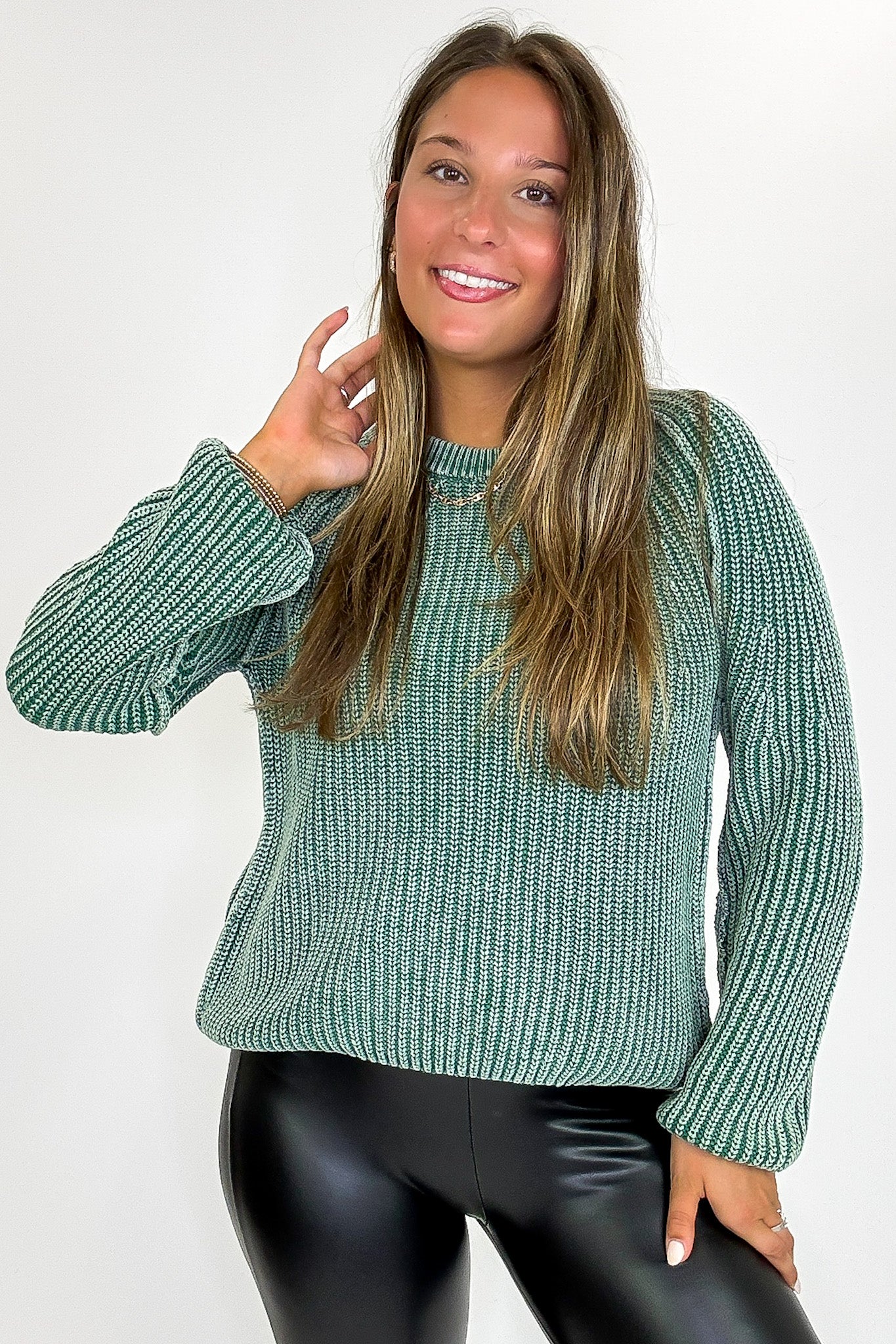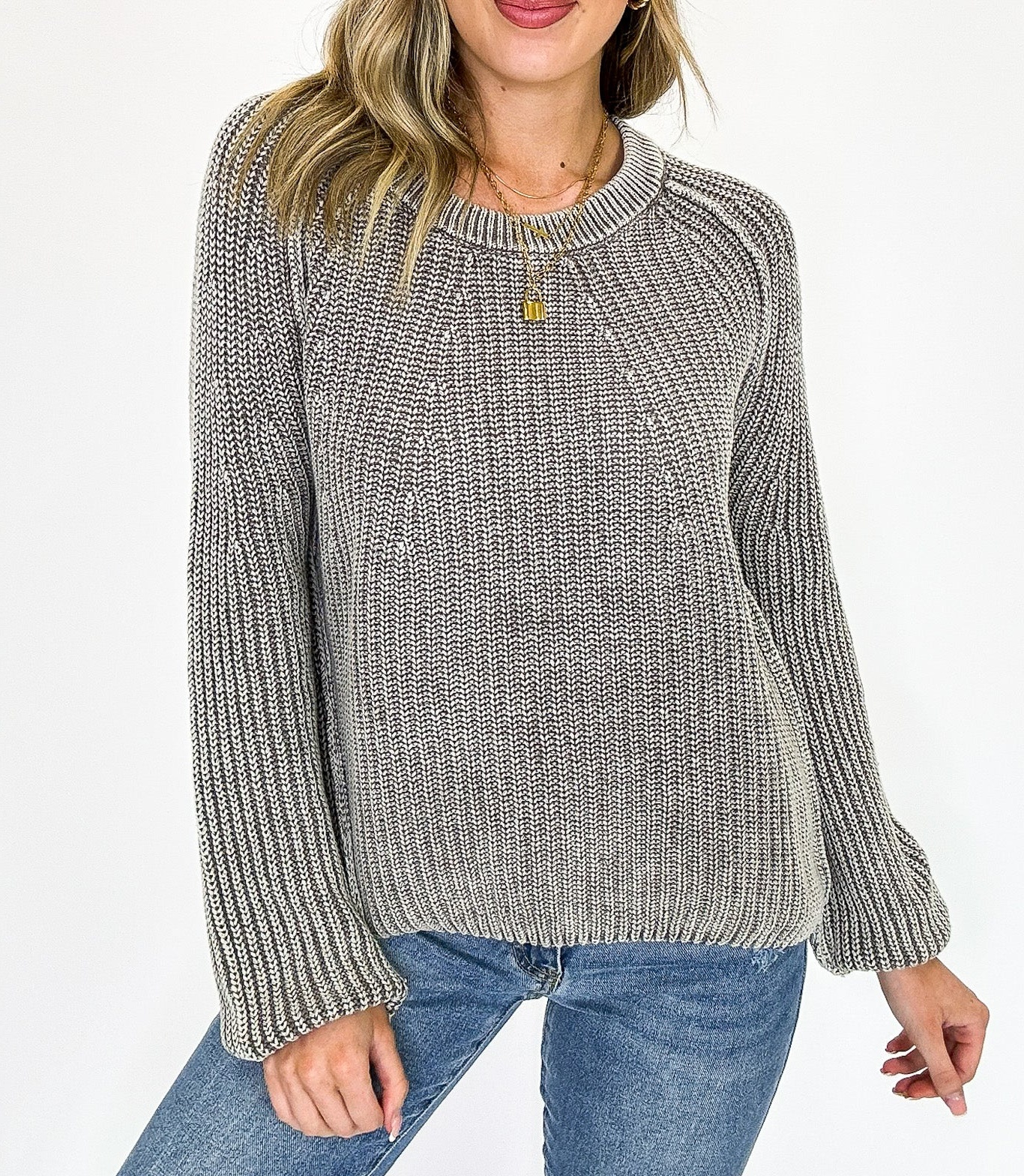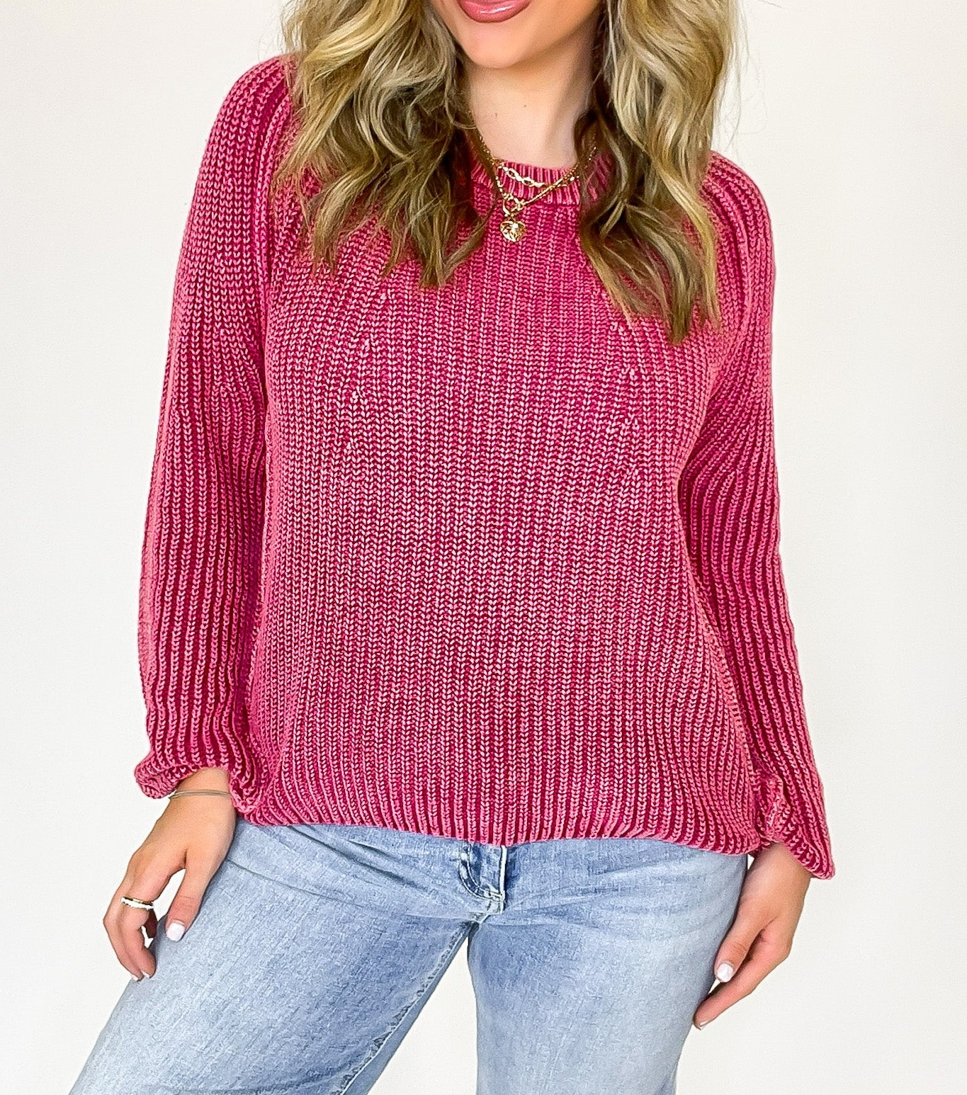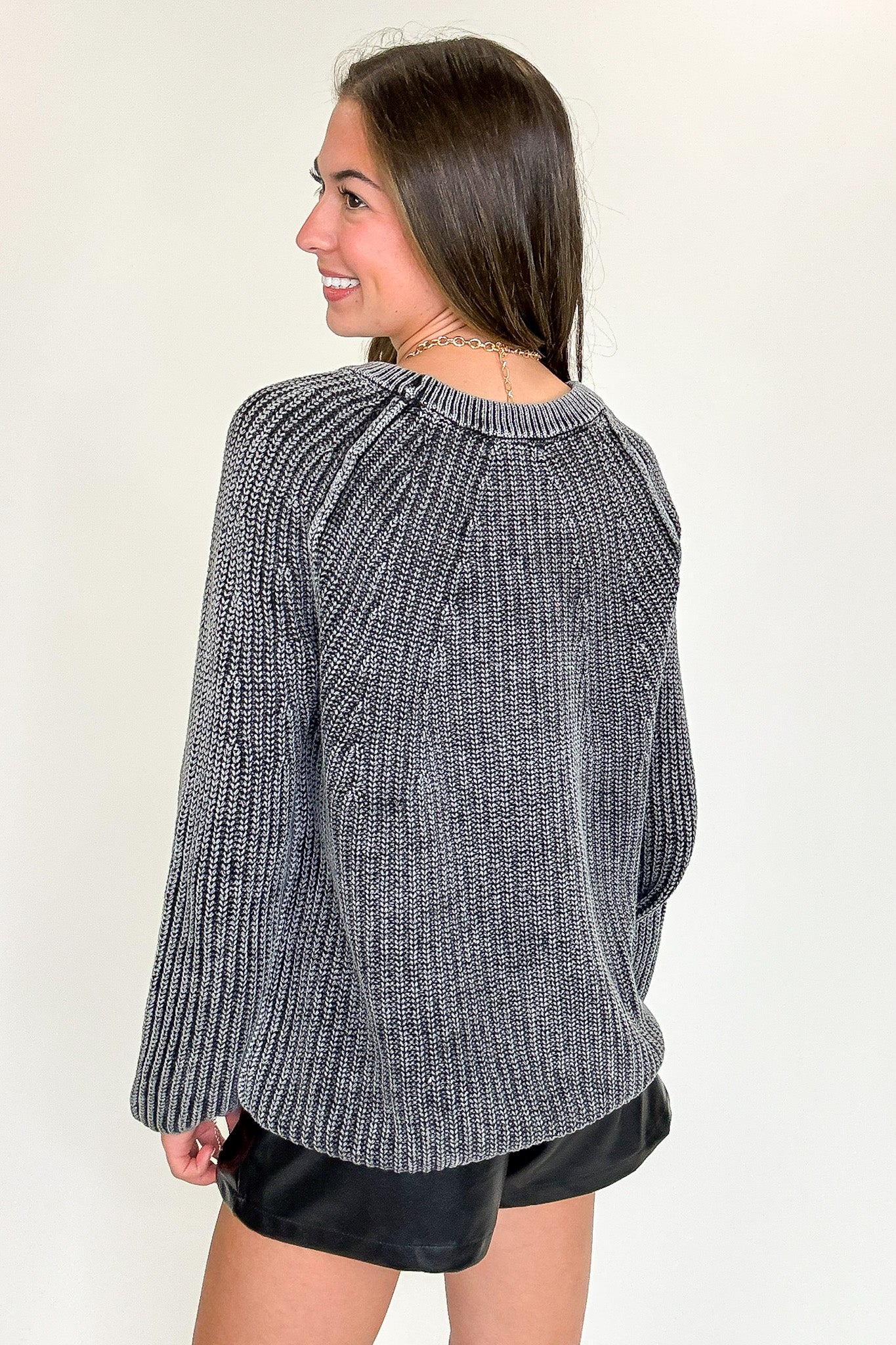 Details: Wrap yourself in laid-back warmth with this effortlessly cozy sweater. Featuring a soft stone-washed finish for that perfectly lived-in look, a classic round neckline, and relaxed fit, it's the ideal piece for casual days, coffee runs, or curling up by the fire. Pairs perfectly with your favorite denim or leggings for all-season comfort.