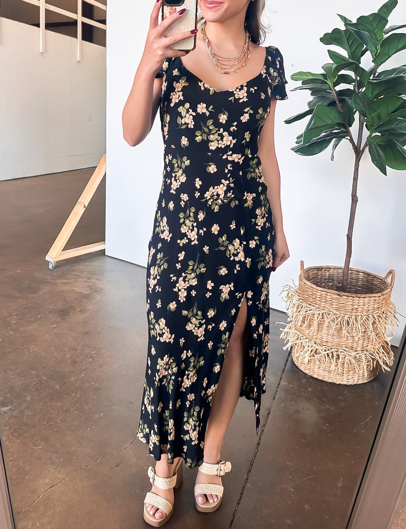 Details: Make a statement in our Floral Ruffle Sleeve Midi Dress. This charming dress features a flattering V-neckline, playful ruffle sleeves, and a flirty side slit. The perfect combination of style and comfort, our dress is perfect for any occasion. (And did we mention it's covered in pretty florals!)