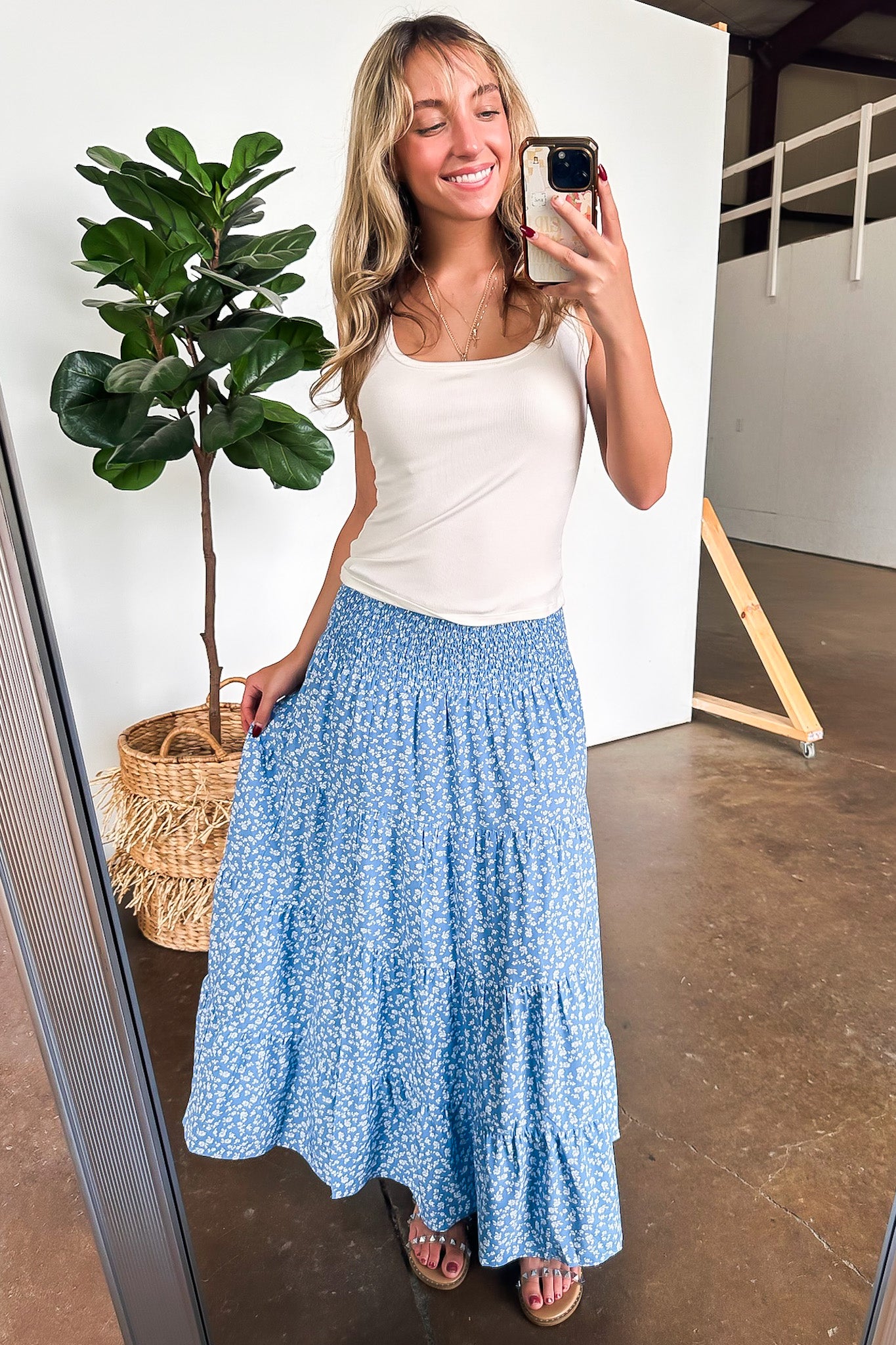 Details: Unleash your inner flower child with this Floral Smocked Midi Skirt! The tiered design and slit add flirty movement, while the smocked waistband provides a comfortable and flattering fit. Perfect for any occasion, this skirt is both stylish and lined for added comfort. Embrace your love for all things floral in this playful and flowy skirt.