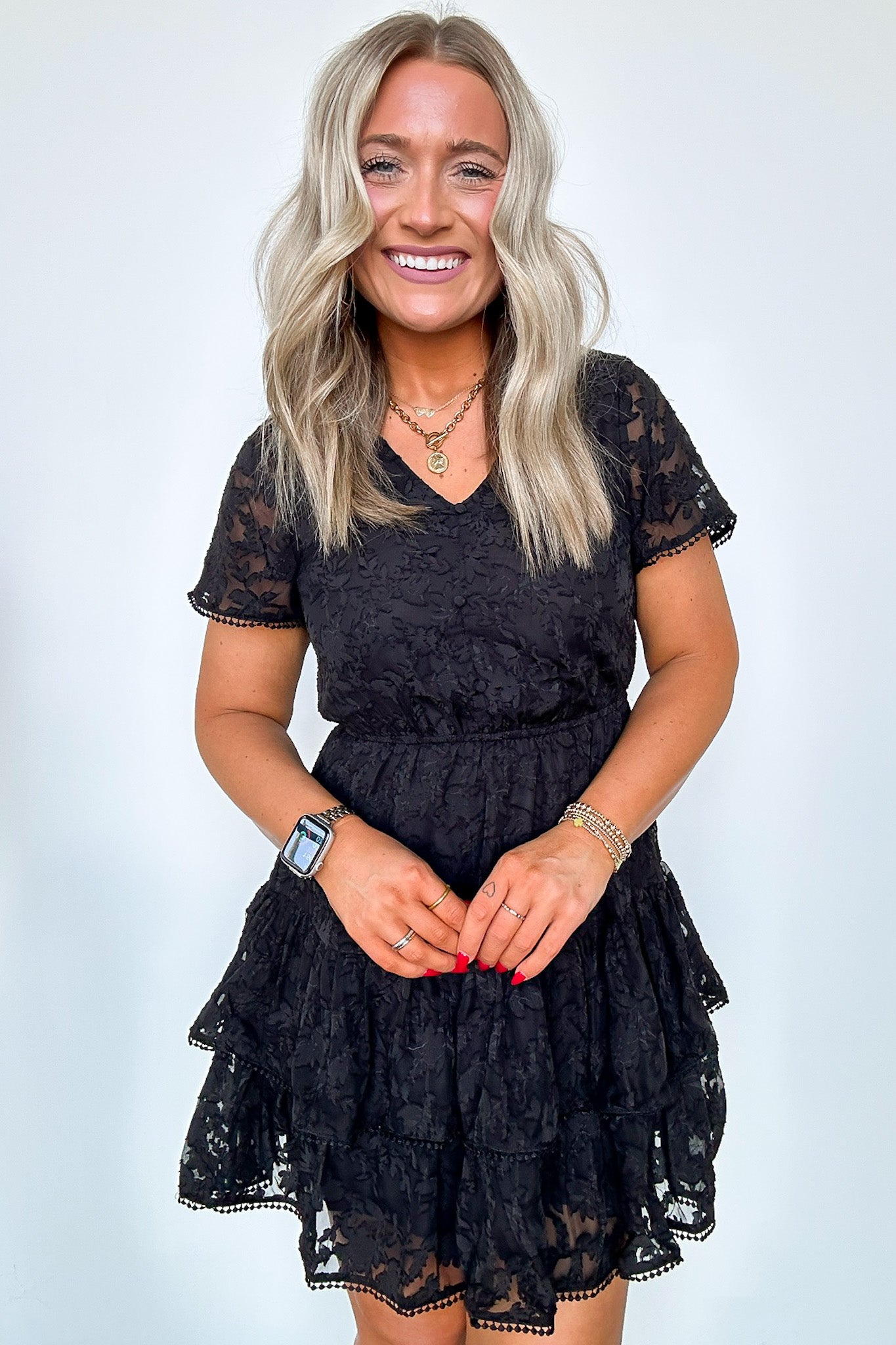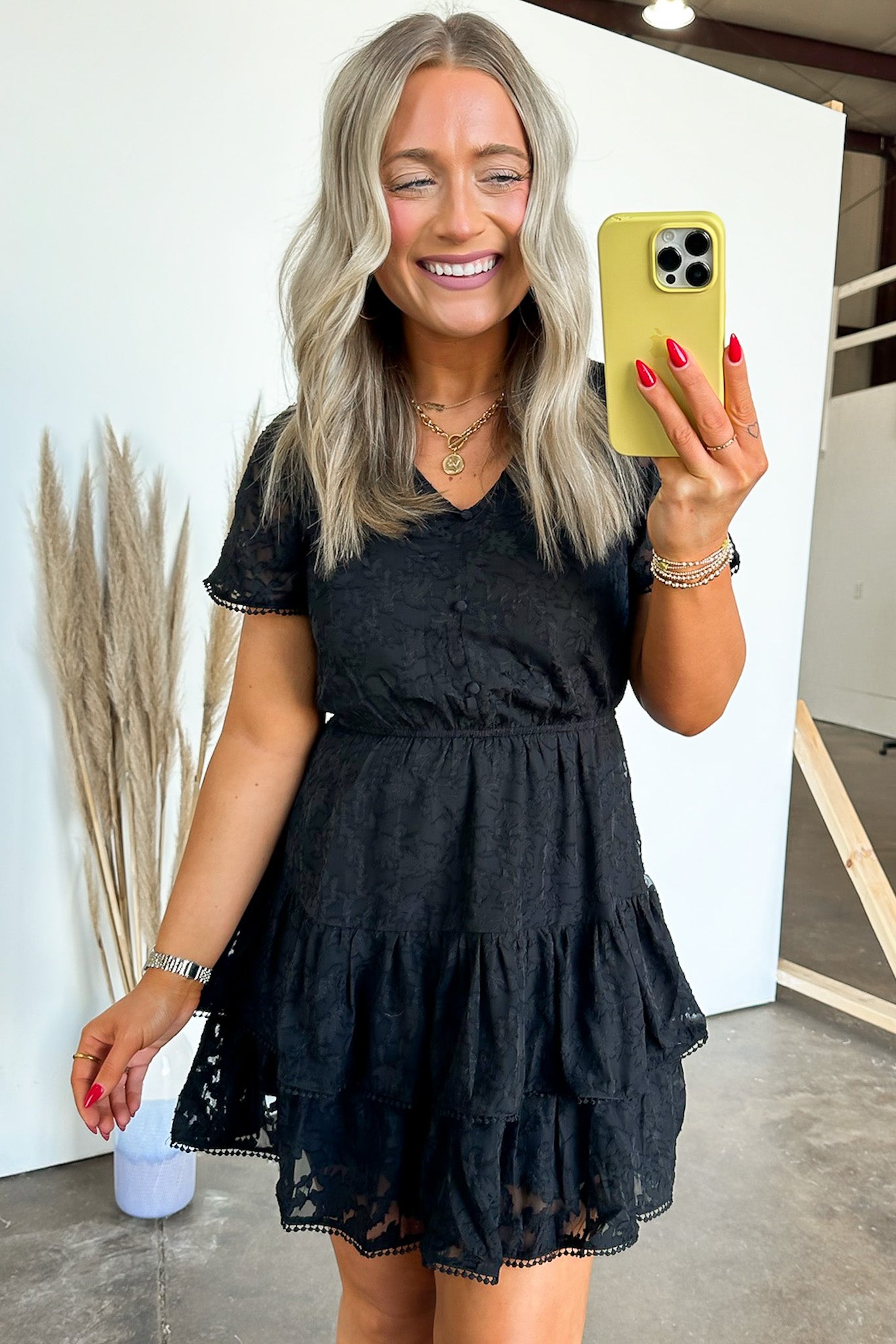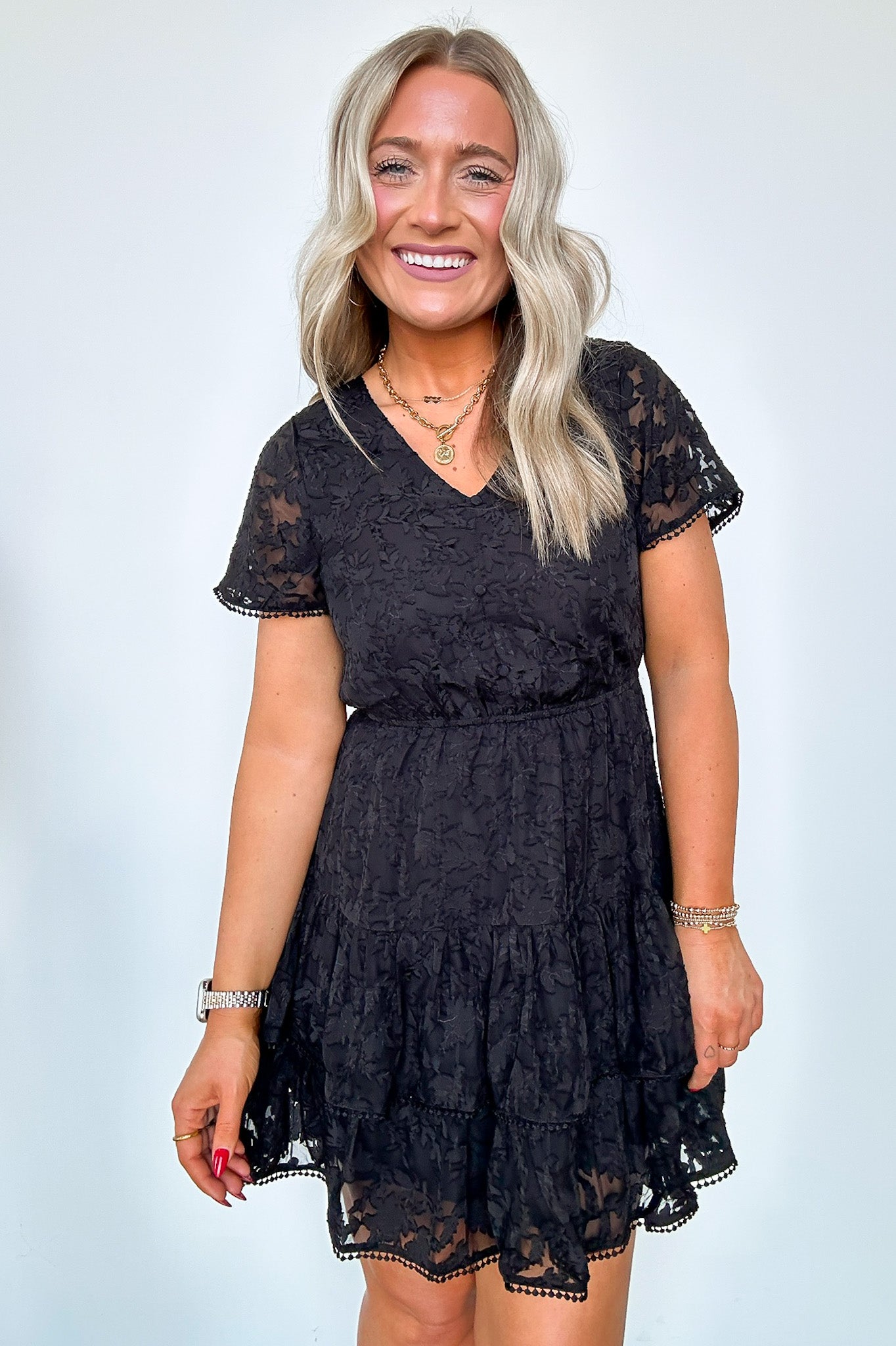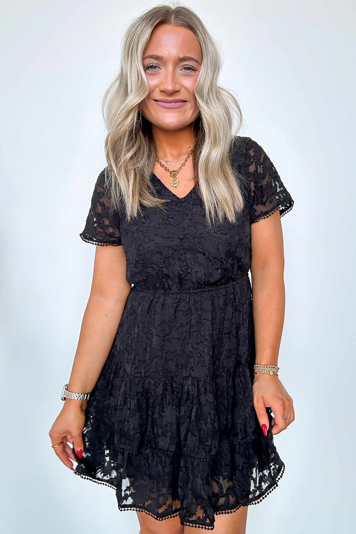 Details: Be the epitome of gorgeous excellence in this lace tiered dress. Show off your playful side with sheer lace and pompom details. Stand out in this mini dress that exudes both elegance and fun.