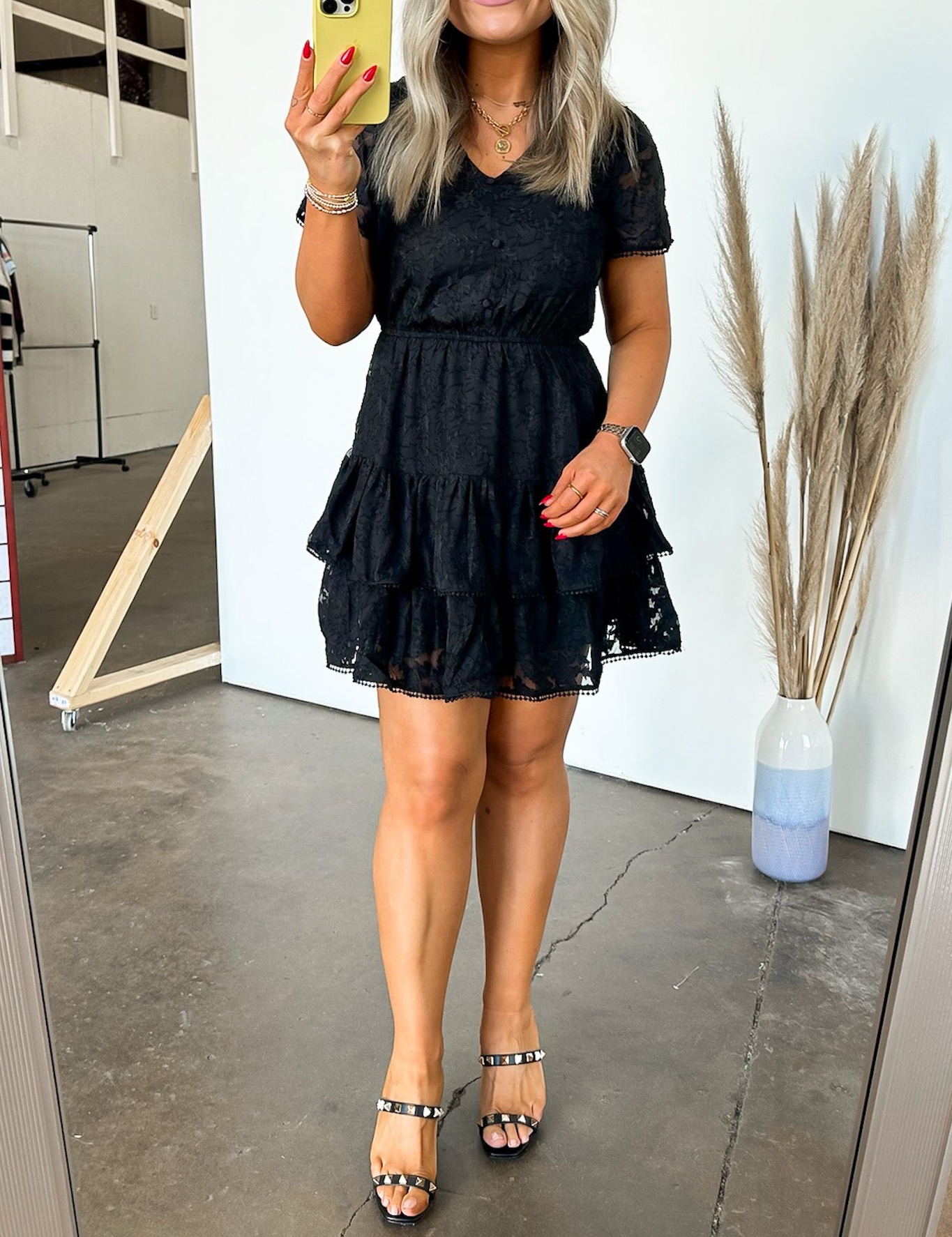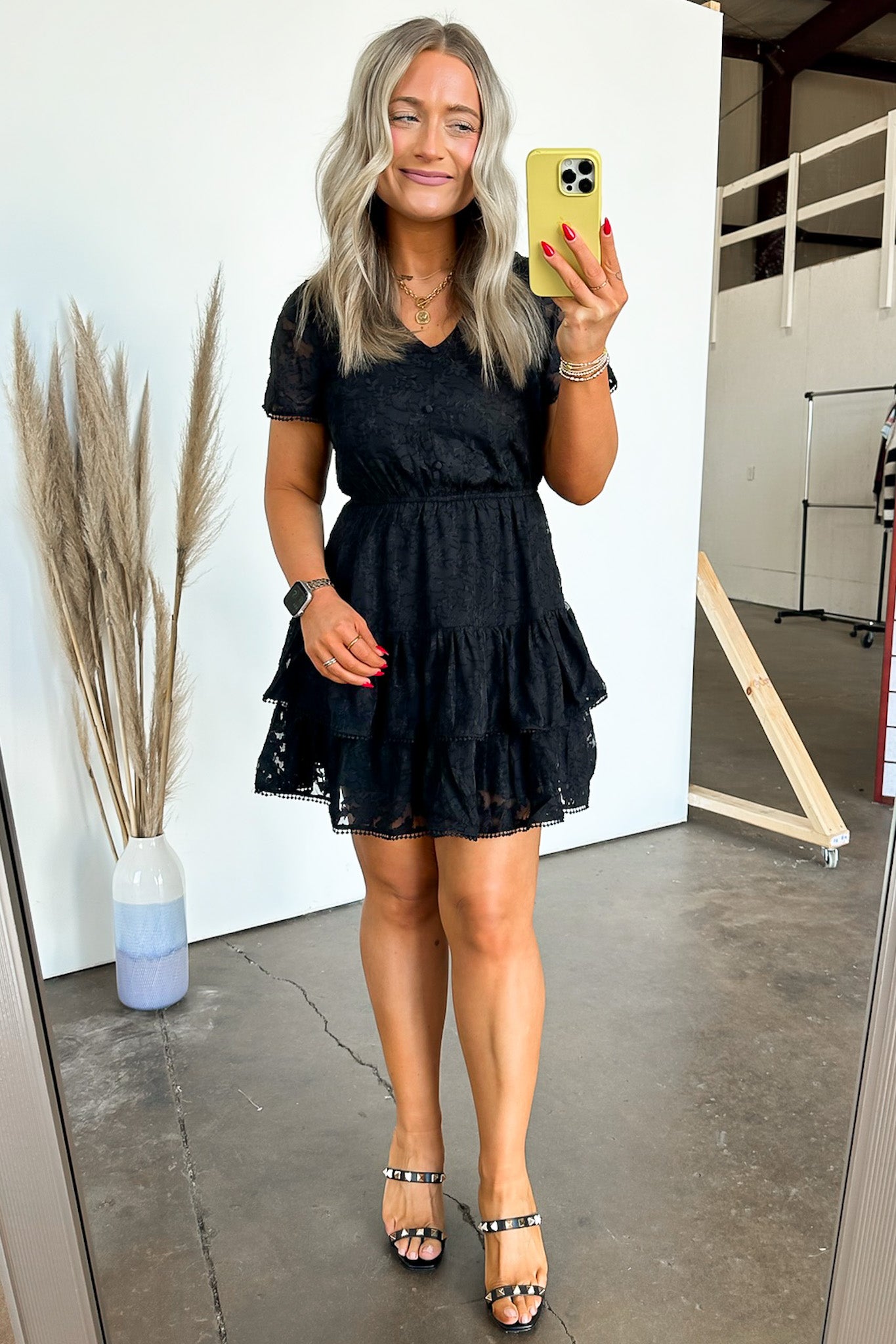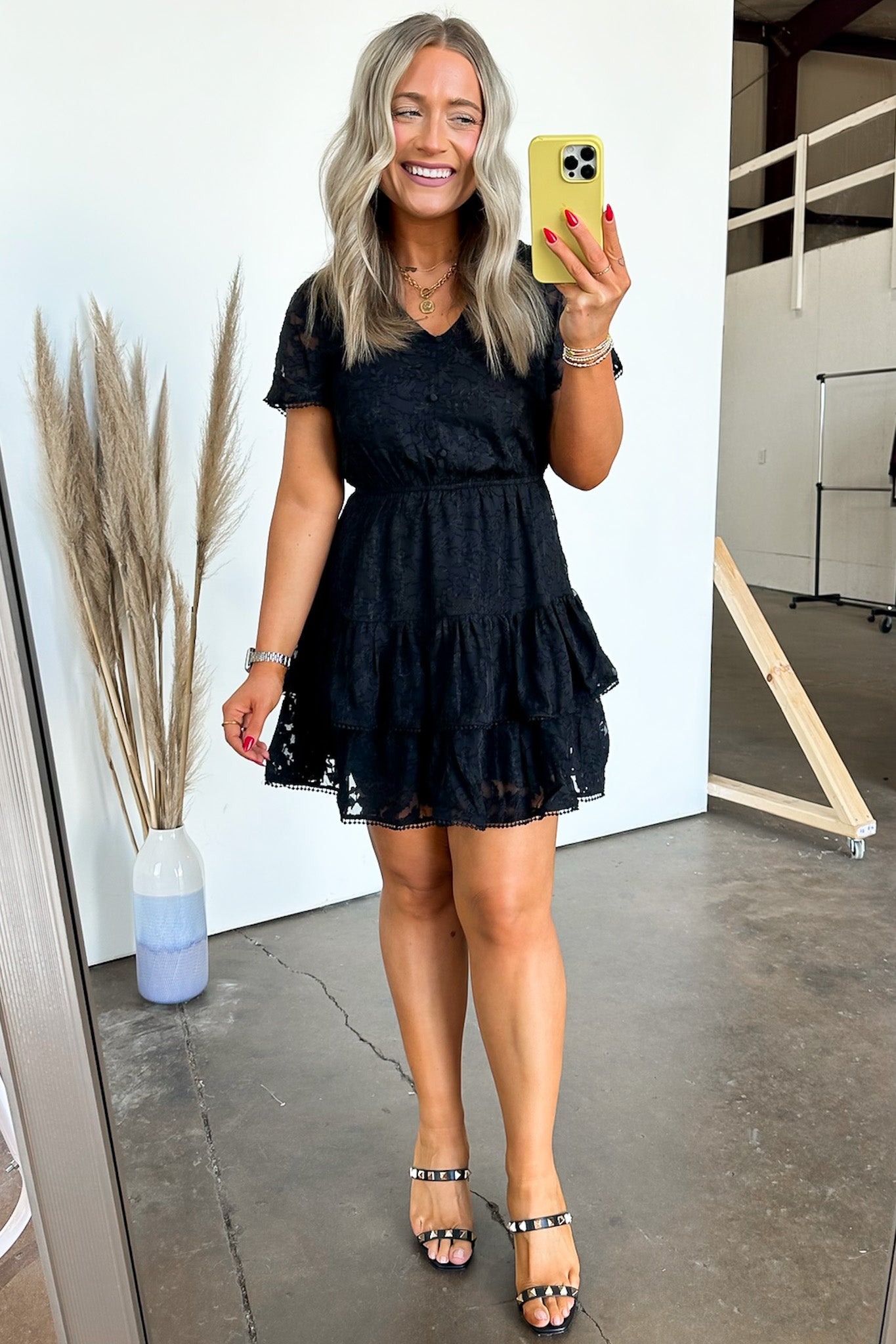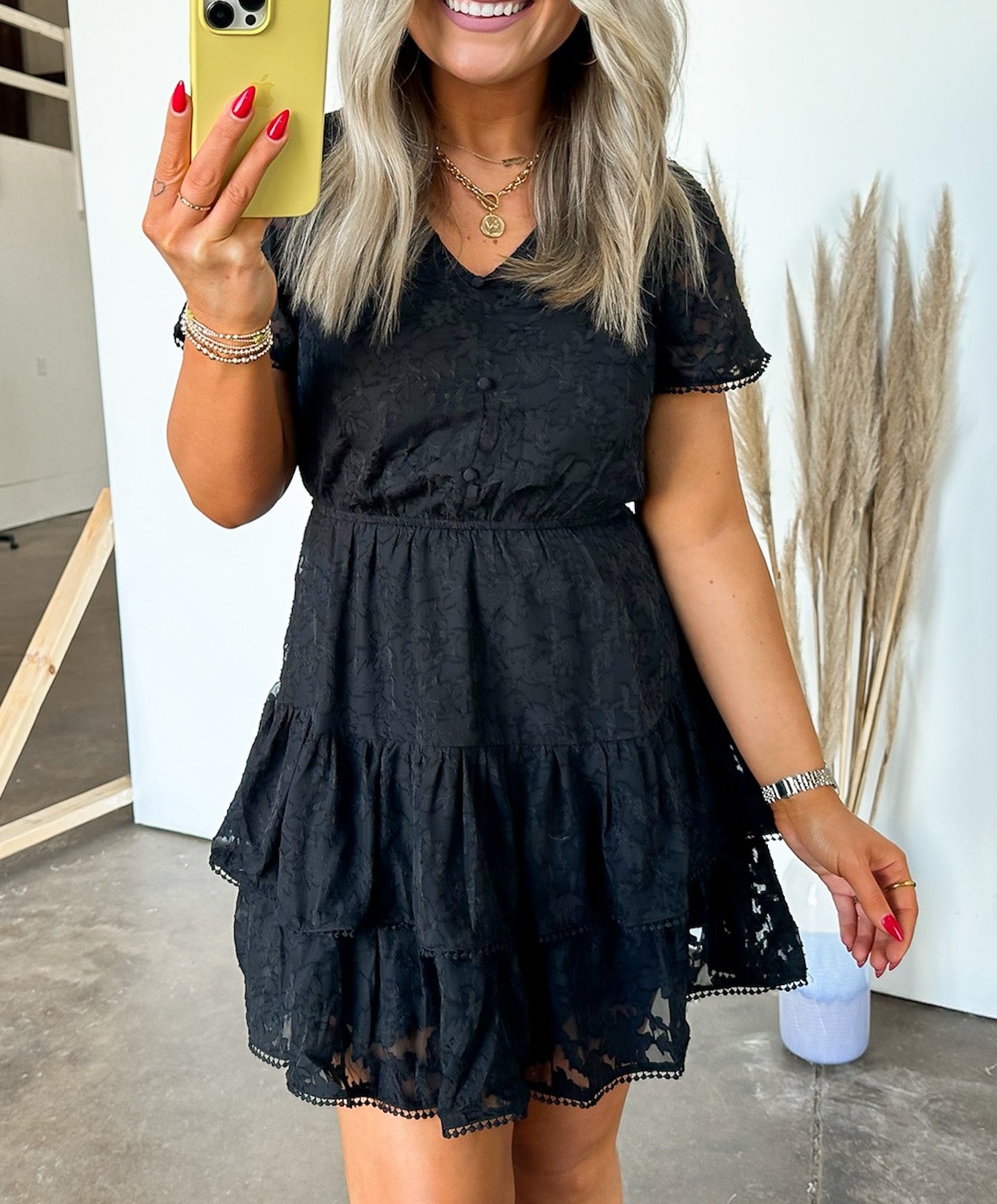 Details: Be the epitome of gorgeous excellence in this lace tiered dress. Show off your playful side with sheer lace and pompom details. Stand out in this mini dress that exudes both elegance and fun.