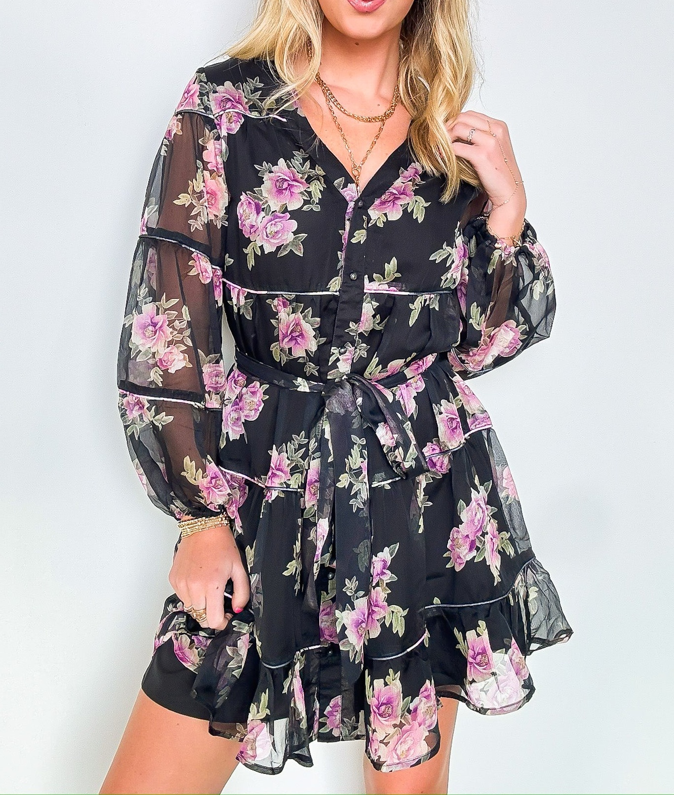Details: Introducing our Dress! This long sleeve button up dress features a tiered design and beautiful floral pattern. Perfect for any occasion, this mini dress is a must-have in your wardrobe. Get ready to look effortlessly chic and stylish.