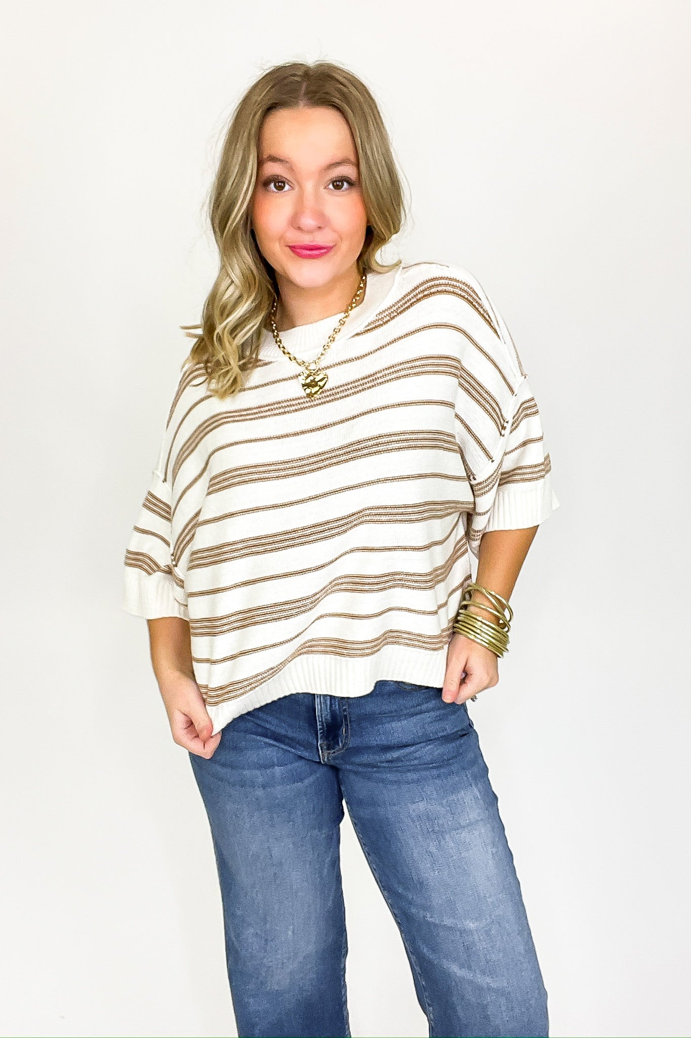 Details: Effortless style meets everyday comfort in the Luxe Line Top. Featuring timeless stripes and a relaxed 3/4 sleeve fit, this knit top is perfect for layering or wearing on its own. Soft, breathable fabric and a flattering loose silhouette make it a versatile addition to any wardrobe.