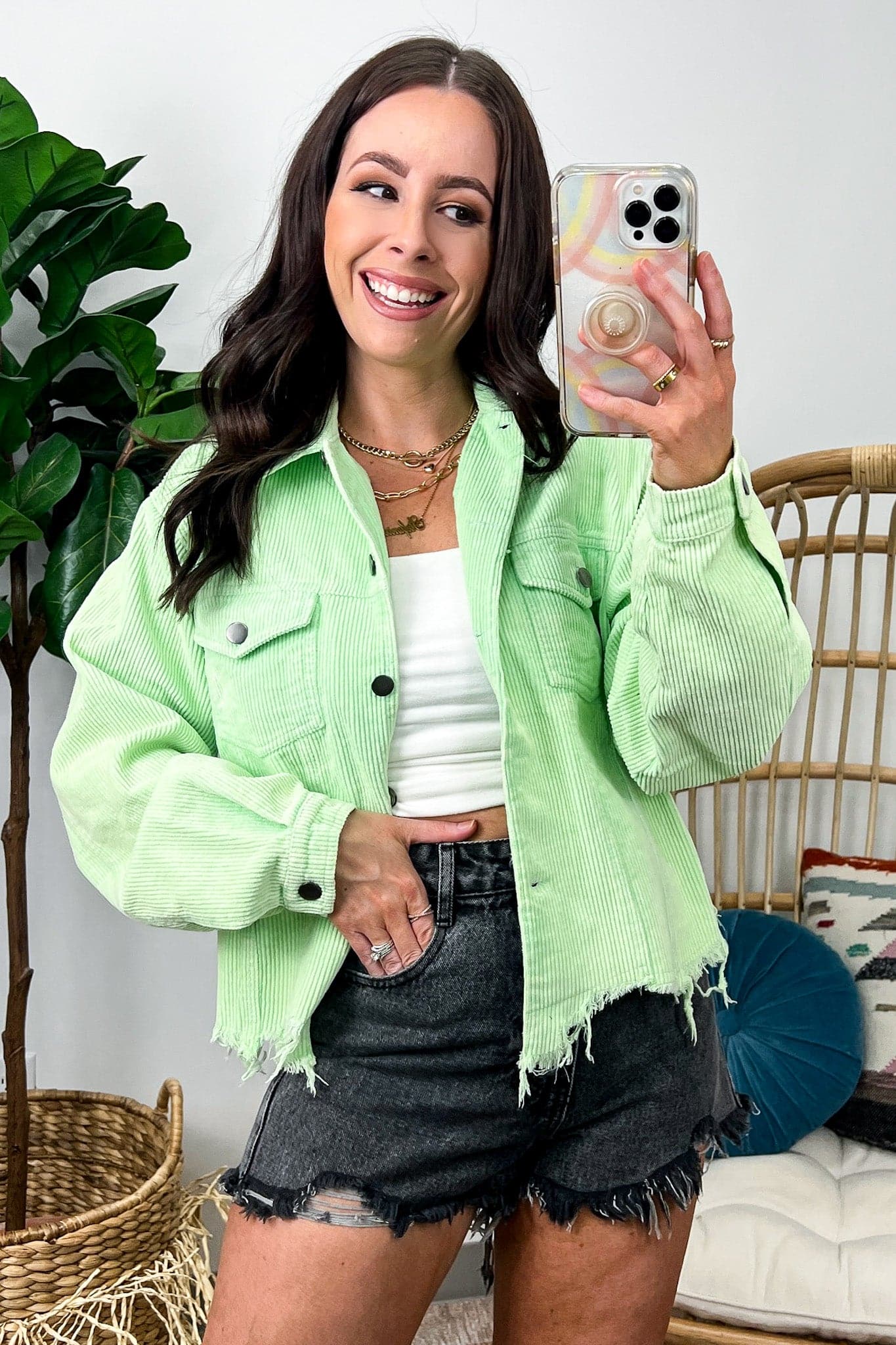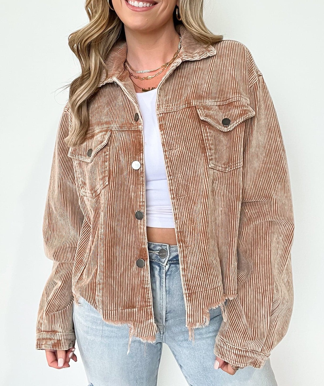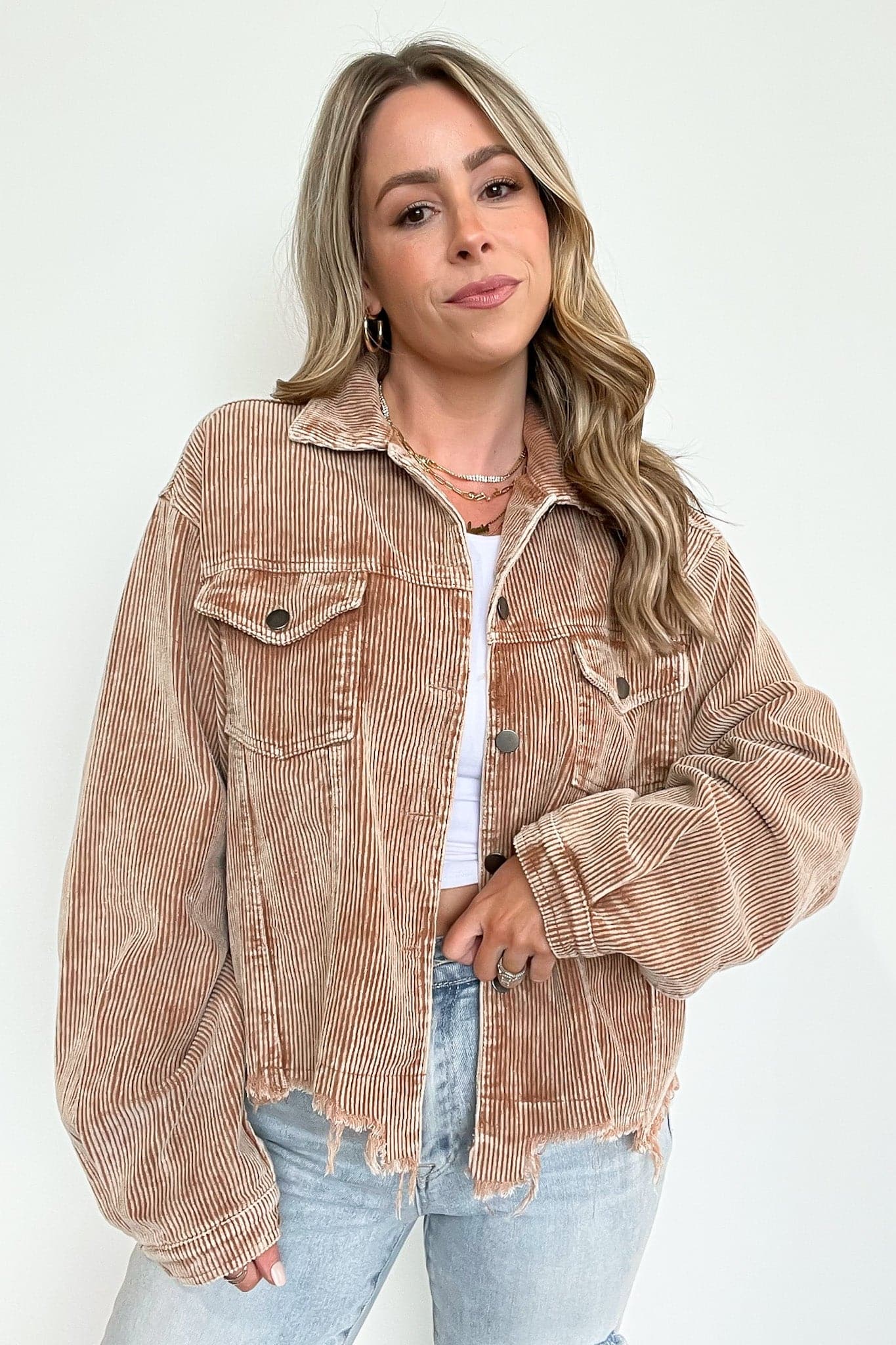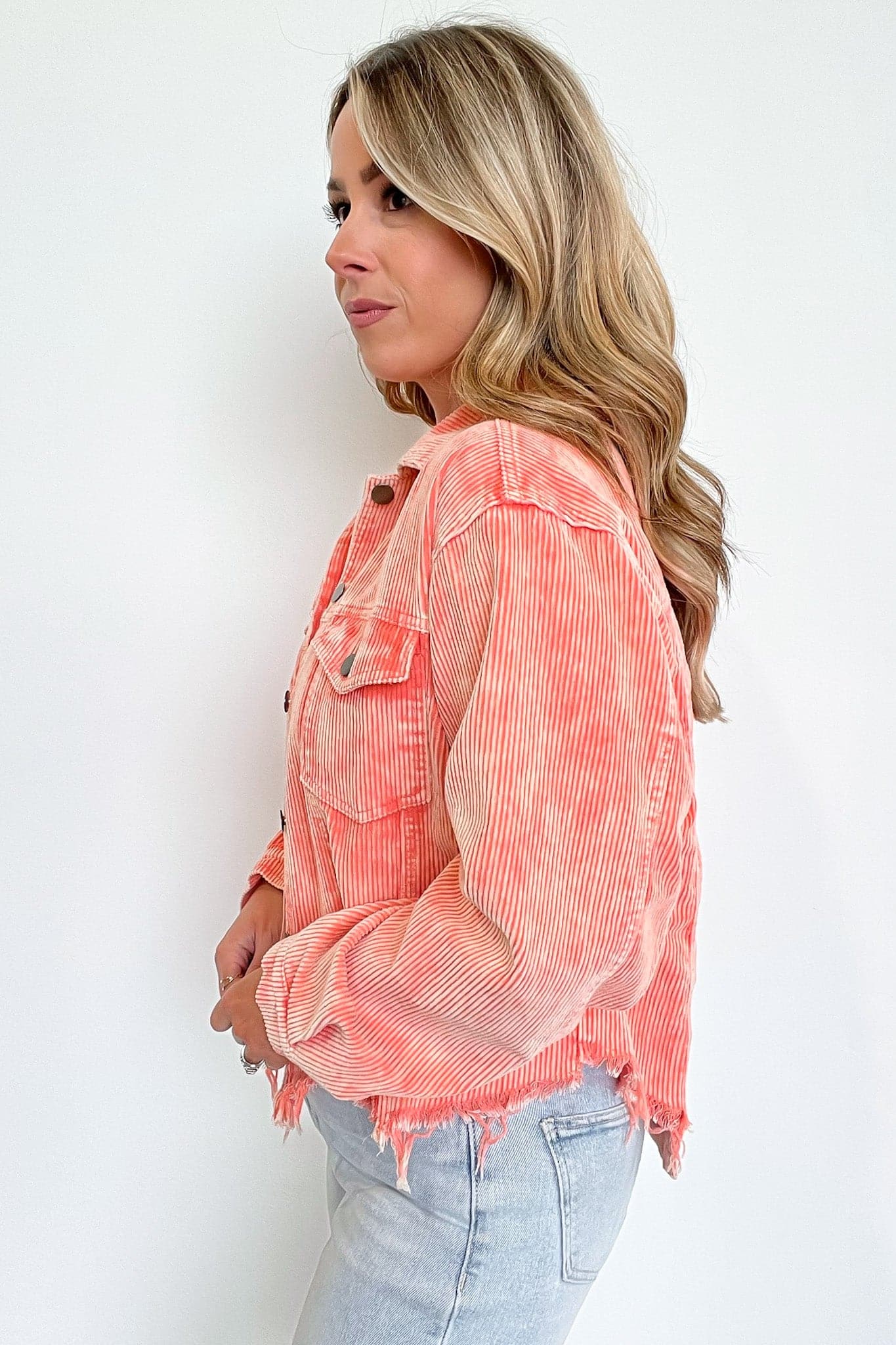 Details:Mainstream Raw Edge Corduroy Jacket - Get ready to add some edgy flair to your wardrobe with this funky corduroy jacket featuring raw edge detailing. This jacket is a must-have for anyone who loves to mix classic styles with a touch of rebelliousness. Don't miss out on this unique piece - grab yours now!