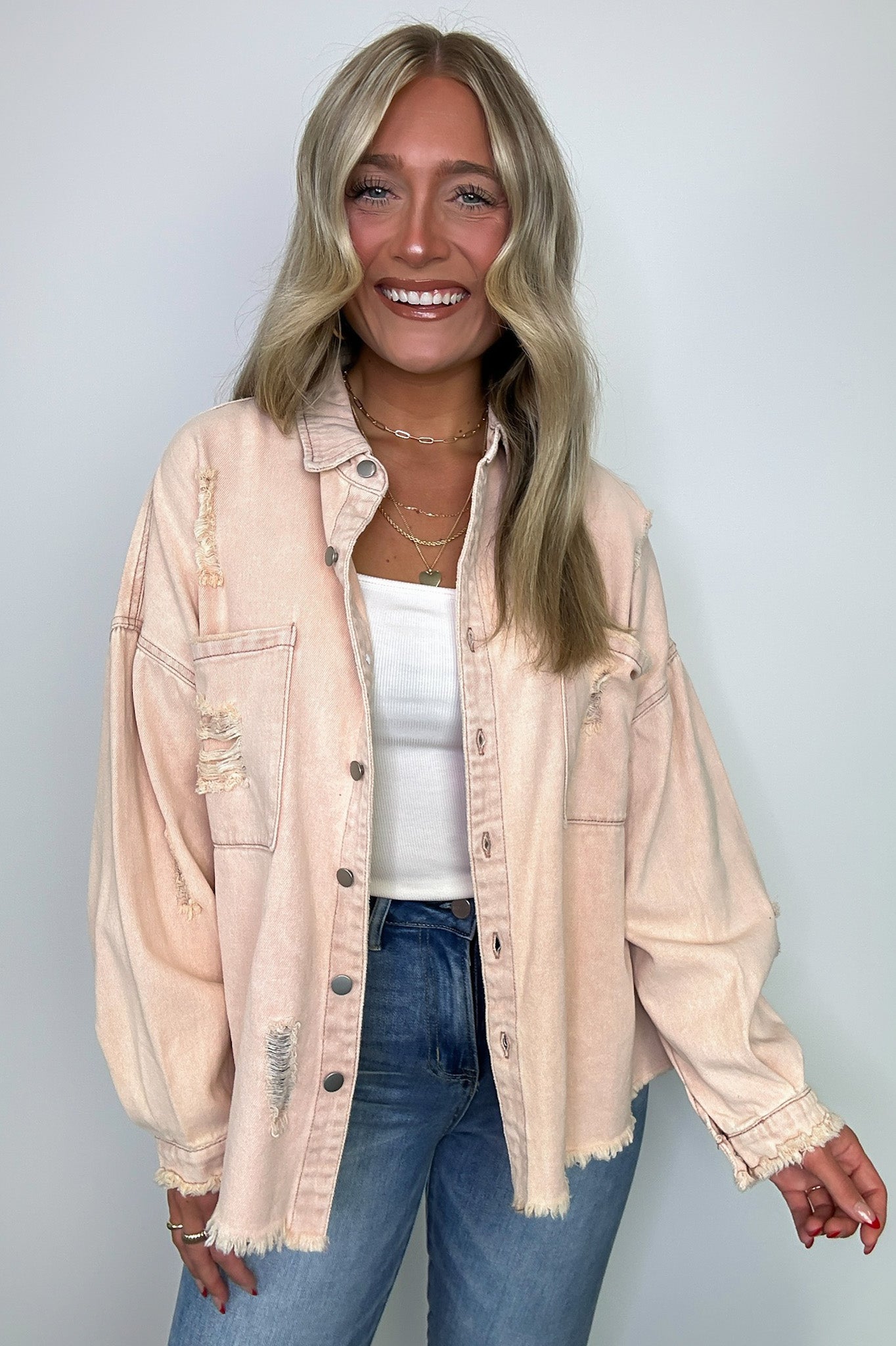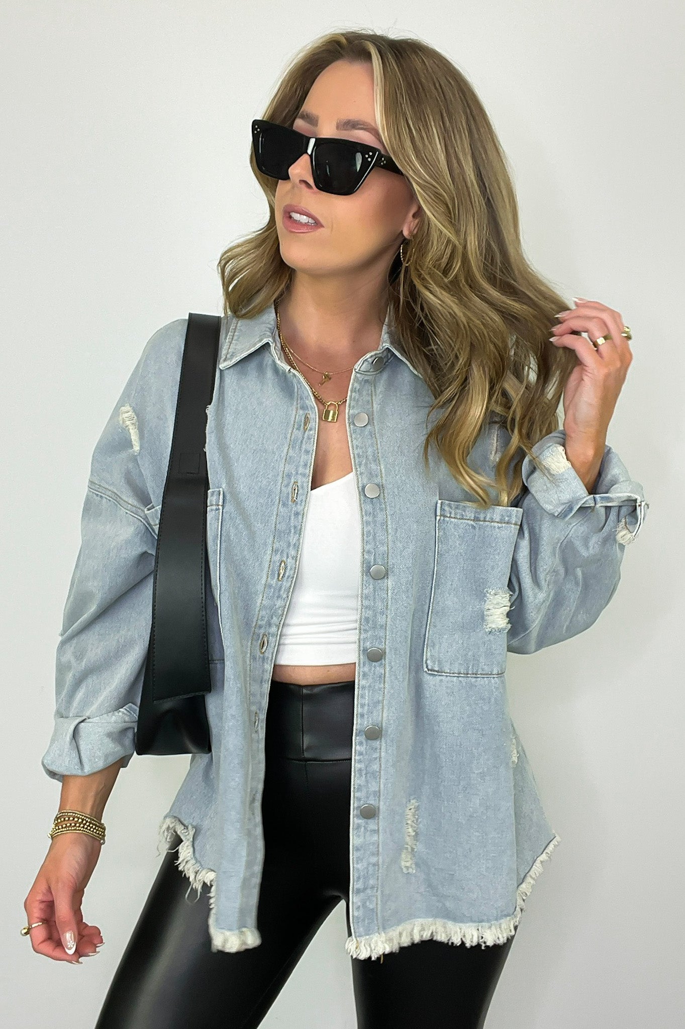 Details: Get ready to slay the street style game with our Oversized Distressed Denim Jacket. Designed in a shirt style with button closure and an oversized fit, this jacket will give you both comfort and style. The balloon sleeves and distressed detailing add a unique touch while the chest pocket and yoke on the back provide functionality. Finished with a small patch featuring Star embroidery and fringe distressed hemline, this jacket is a must-have for any fashion-forward individual.