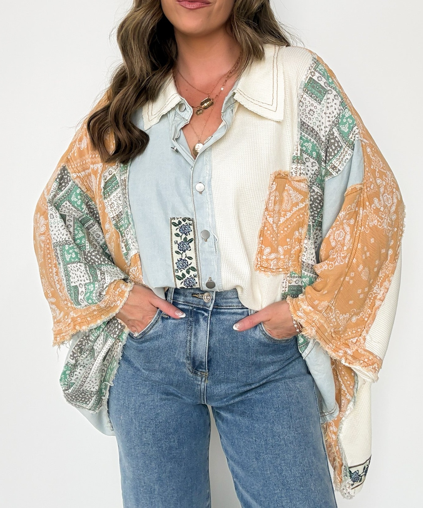Details: Get ready to stand out in our Patchwork Contrast Denim Shirt! This oversized button down features a unique patchwork design in chambray, thermal, and printed wovens. With 3/4 sleeves and raw edges for added style, this shirt is a must-have for anyone looking to make a statement.