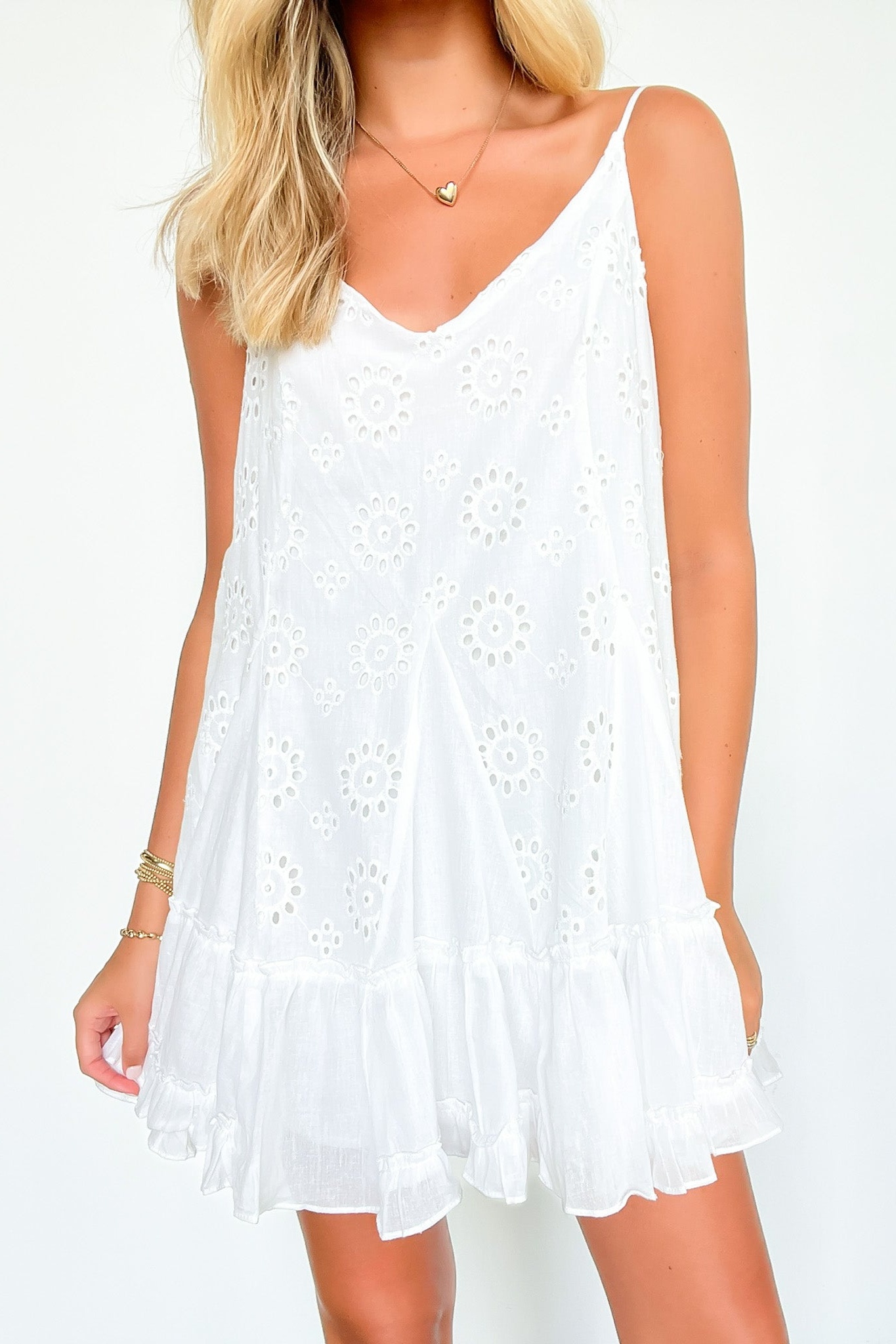 Details: Introducing the Sandria dress - a playful and feminine addition to your wardrobe! Featuring an eyelet ruffle tiered design, this dress adds a touch of charm and whimsy to any outfit. Perfect for a day out with friends or a romantic dinner date.