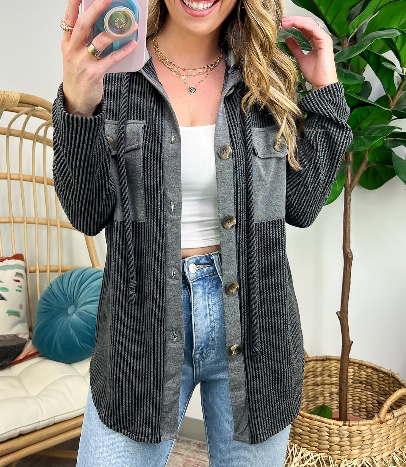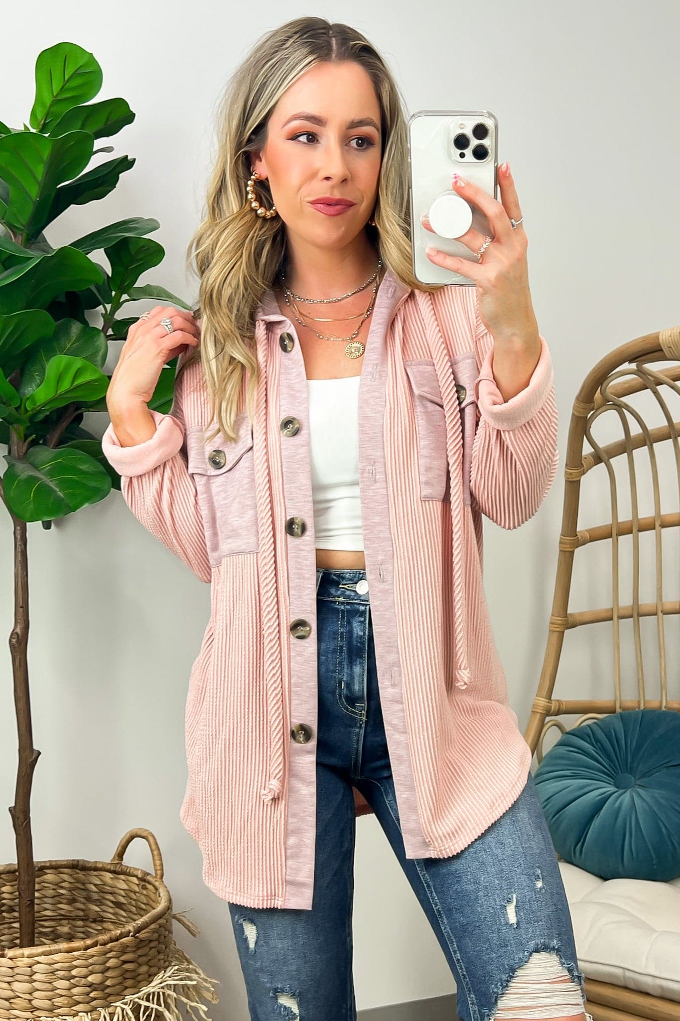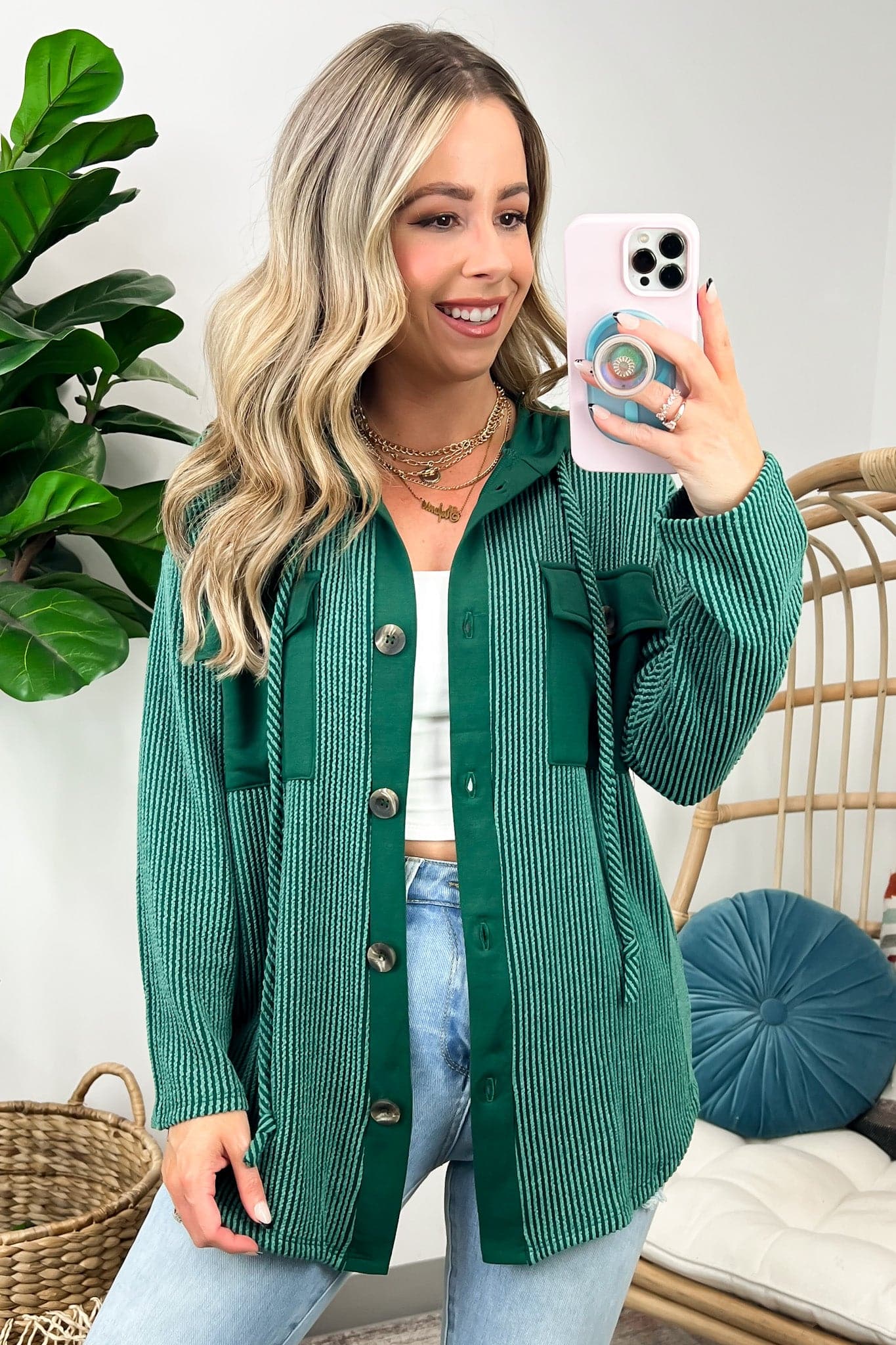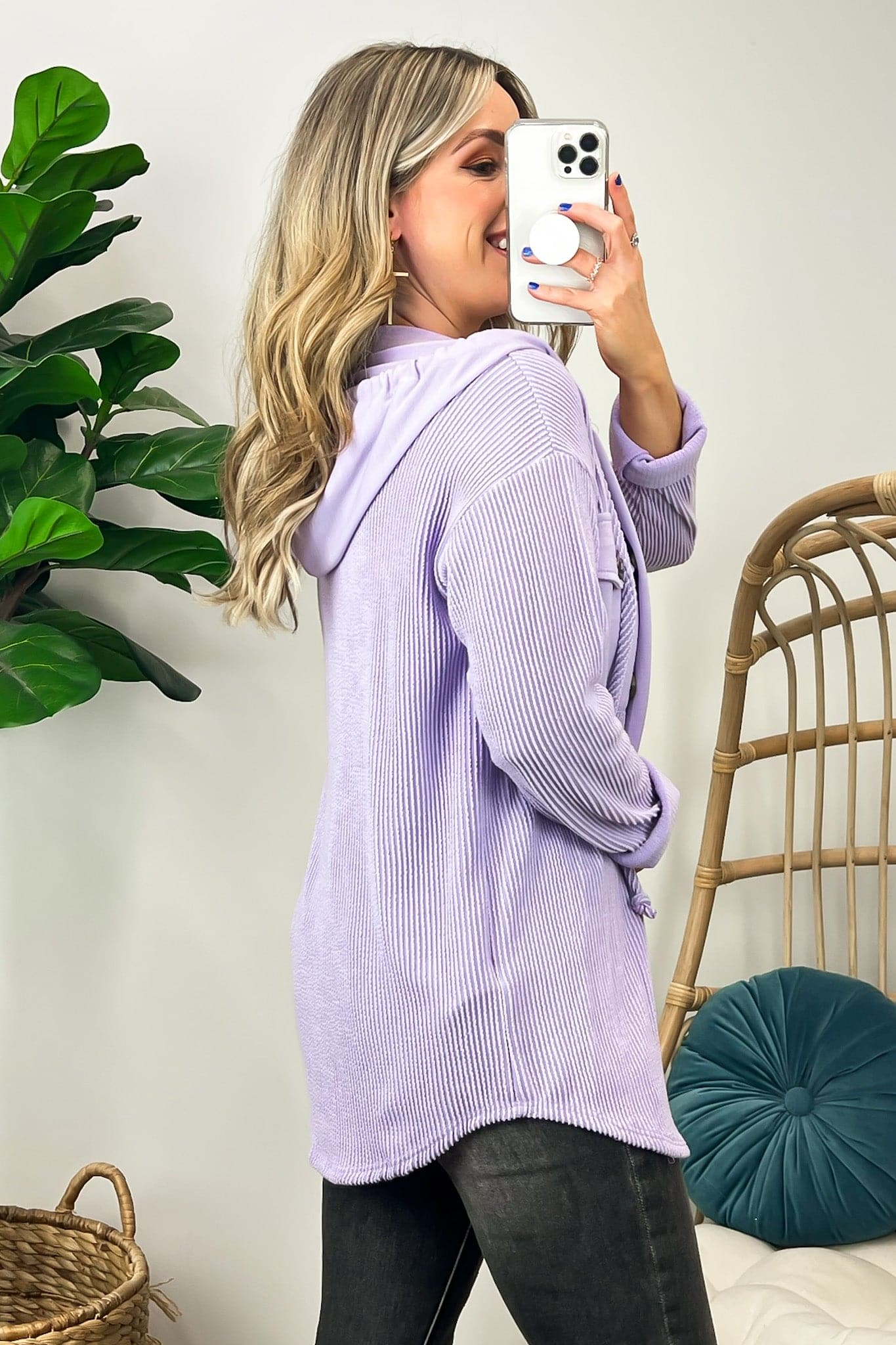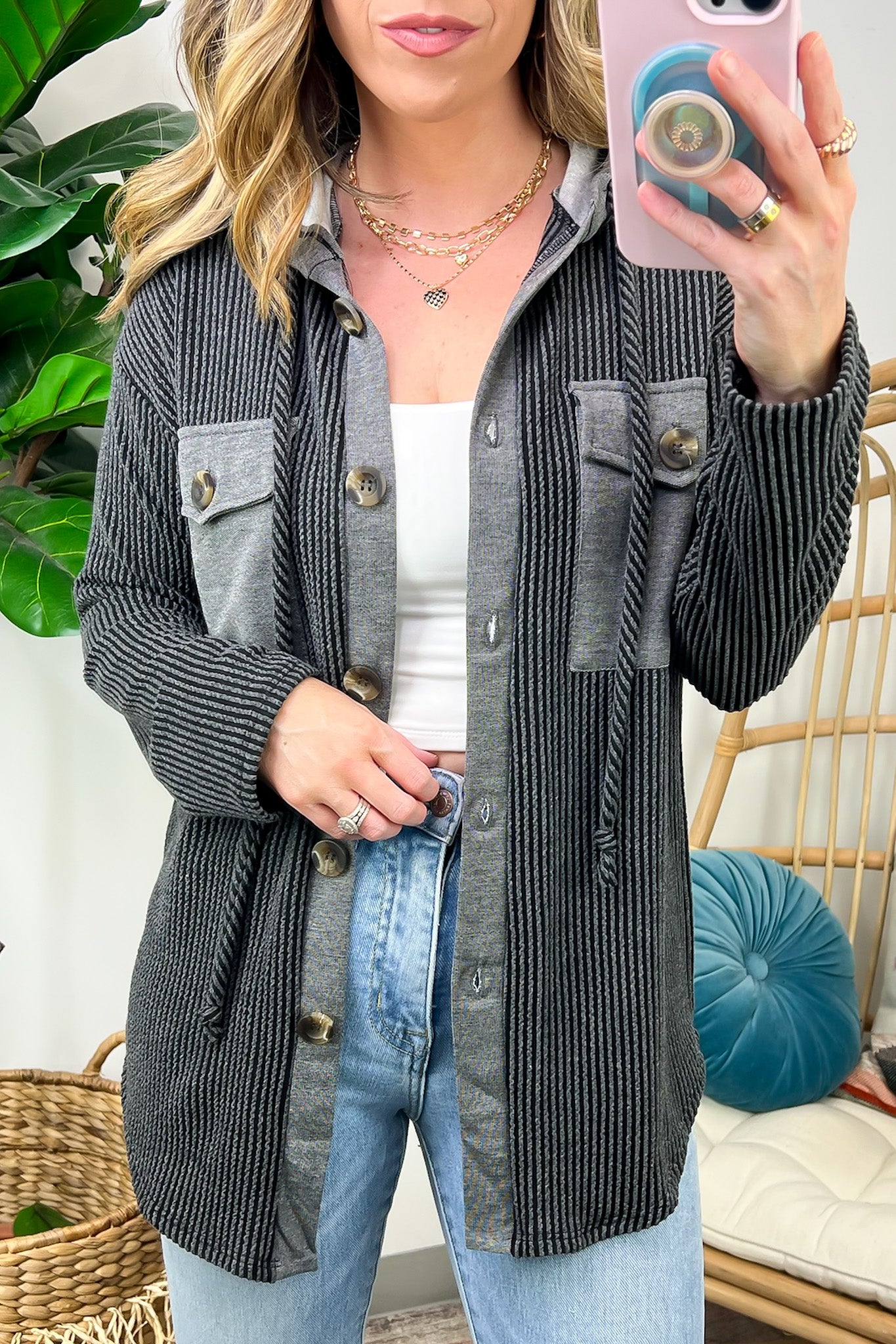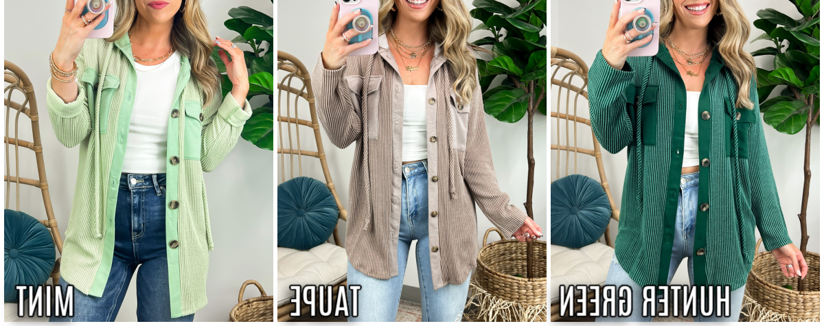 Details: Don't let the chill take away your style! Look cool and stay warm with this Ribbed Button Down Hooded Top. This cozy top is perfect for fall and winter days, with ribbed detail and a hood for extra comfort. Plus, you get the classic button down silhouette with a unique twist! Warm and stylish? What more could you ask for?