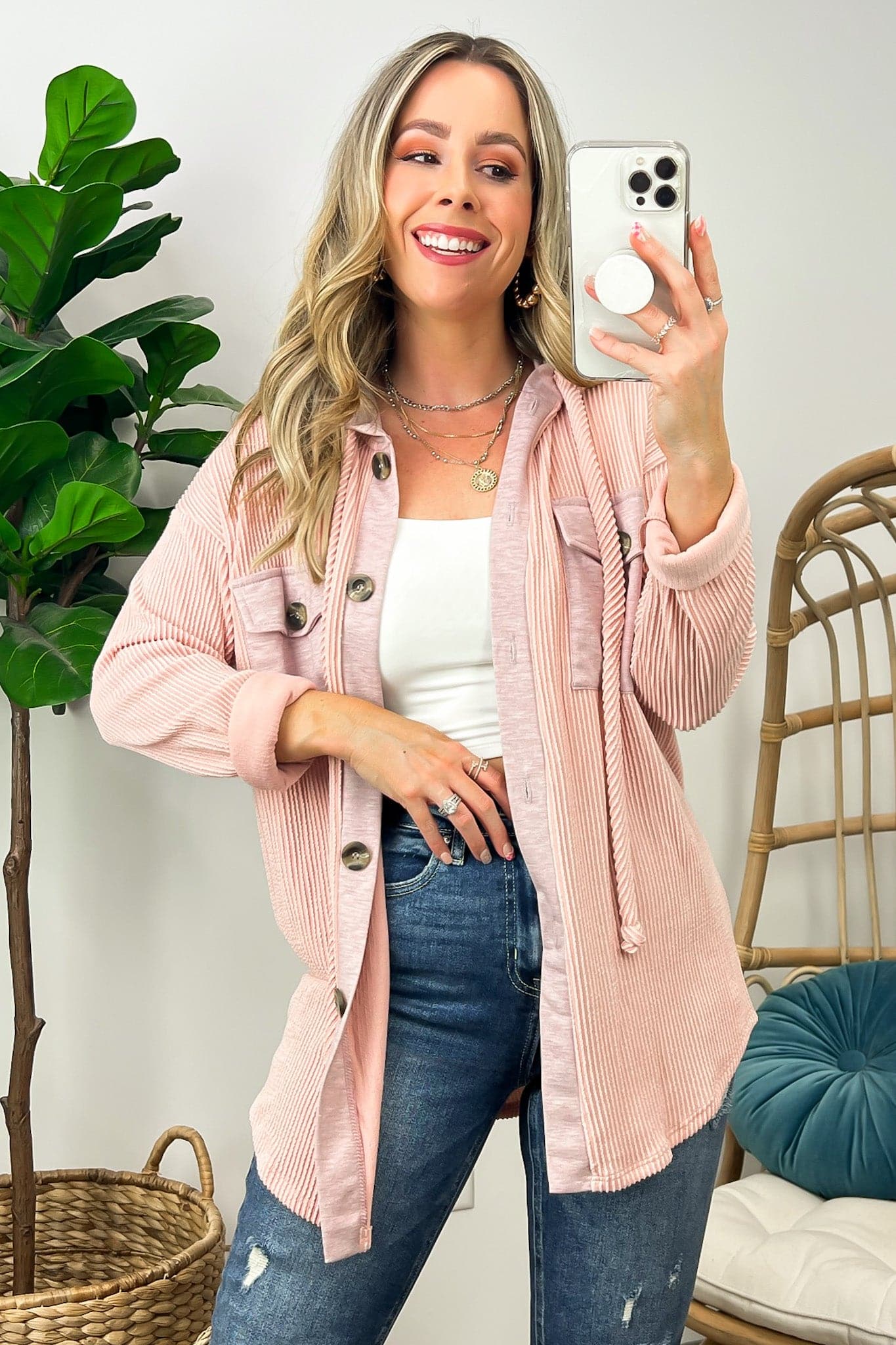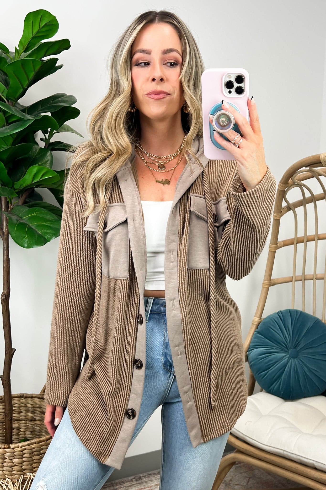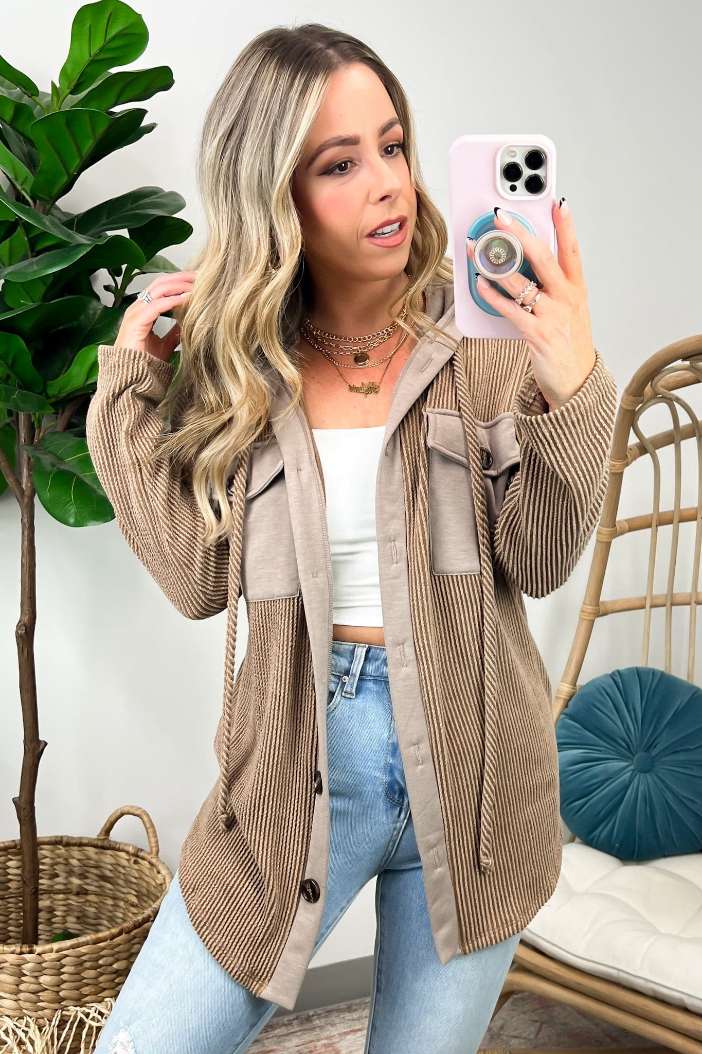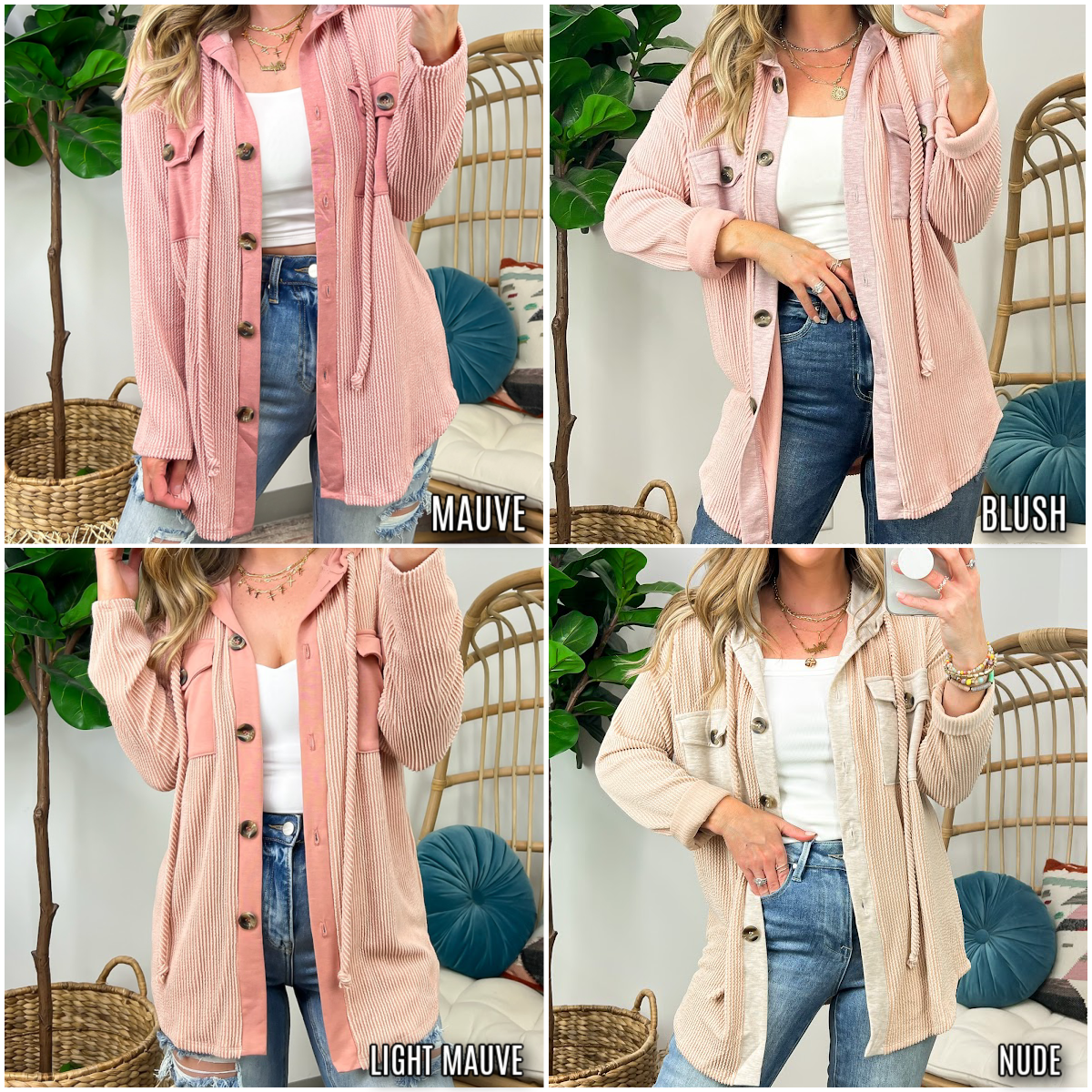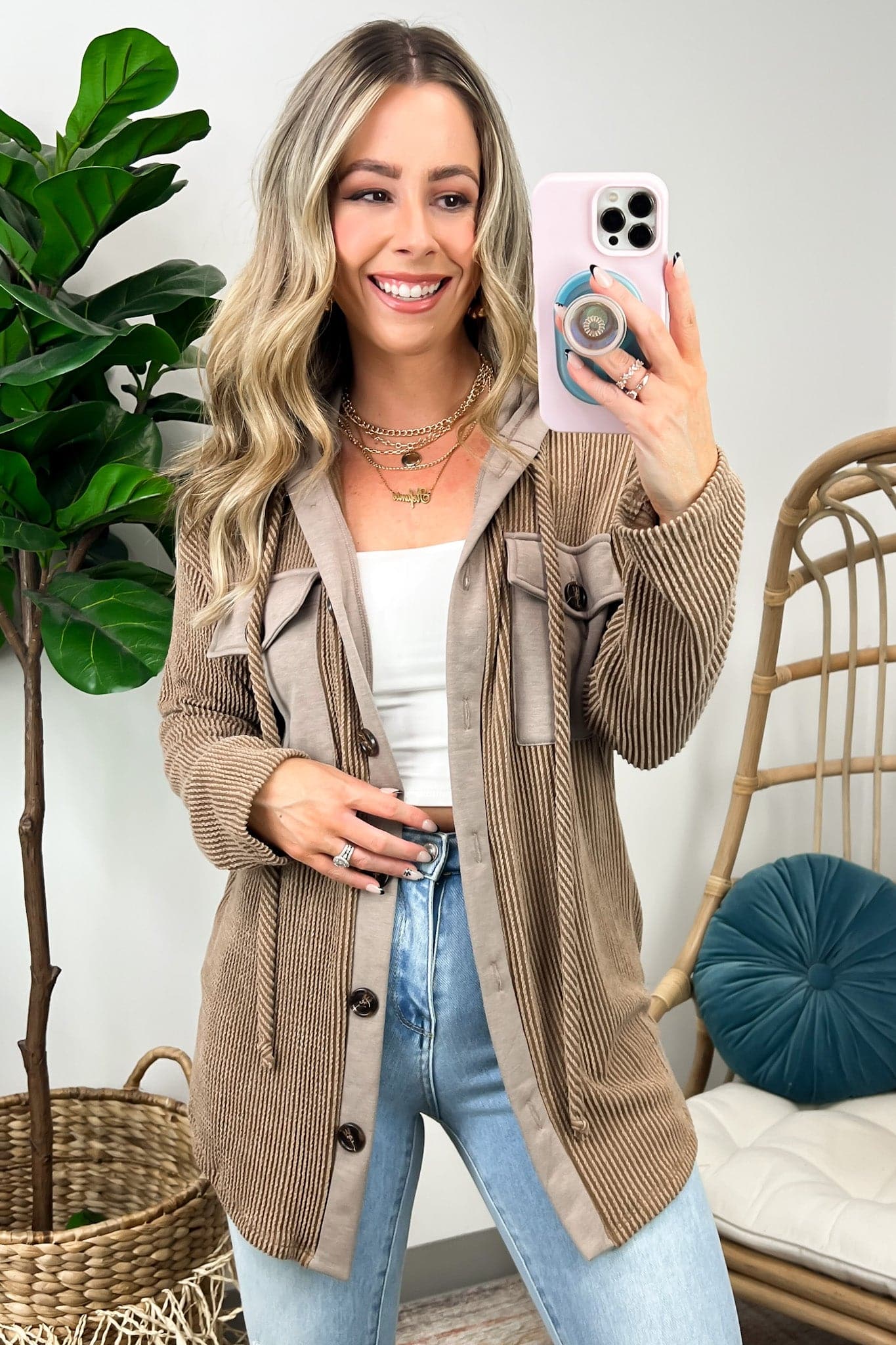 Details: Don't let the chill take away your style! Look cool and stay warm with this Ribbed Button Down Hooded Top. This cozy top is perfect for fall and winter days, with ribbed detail and a hood for extra comfort. Plus, you get the classic button down silhouette with a unique twist! Warm and stylish? What more could you ask for?
