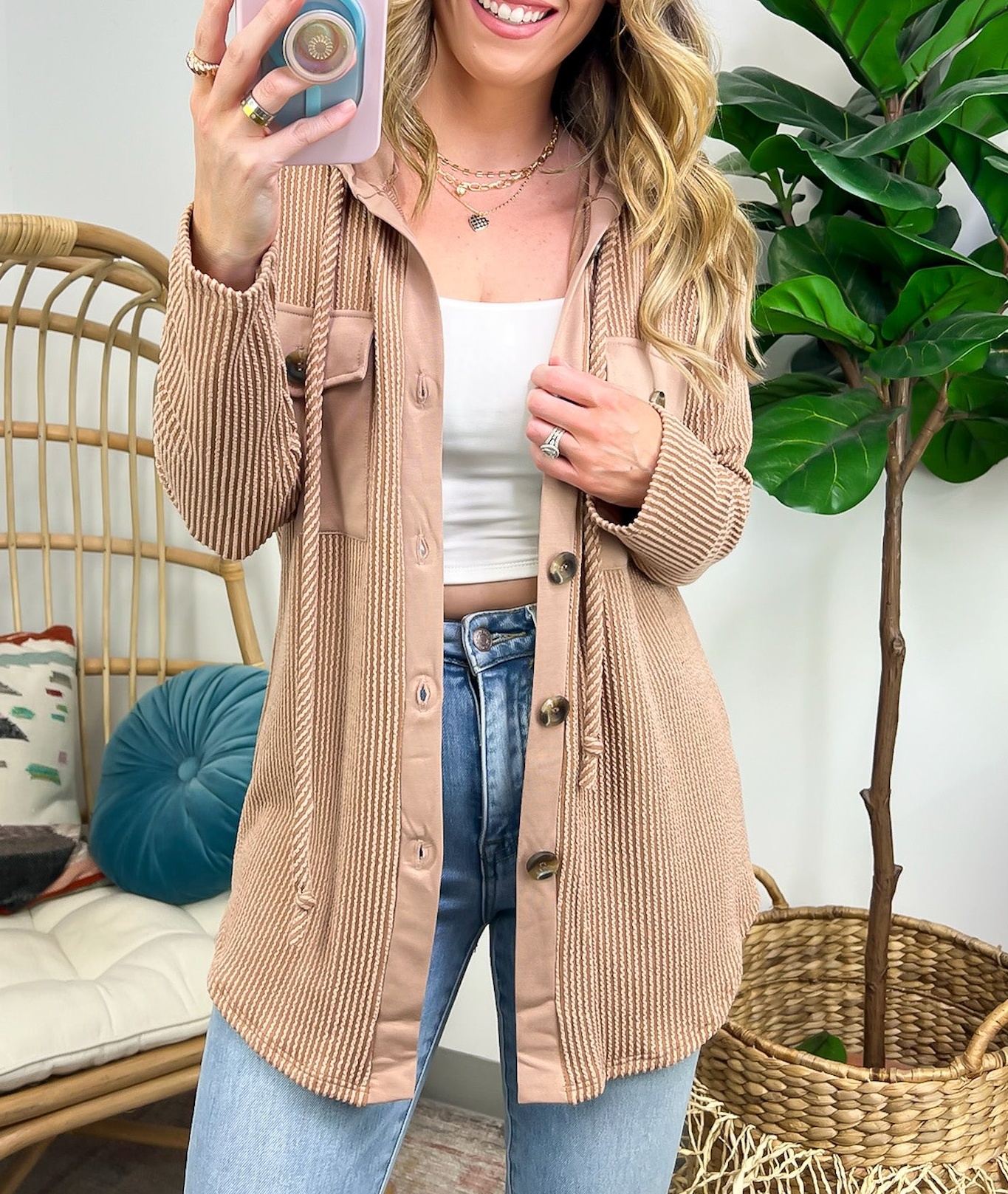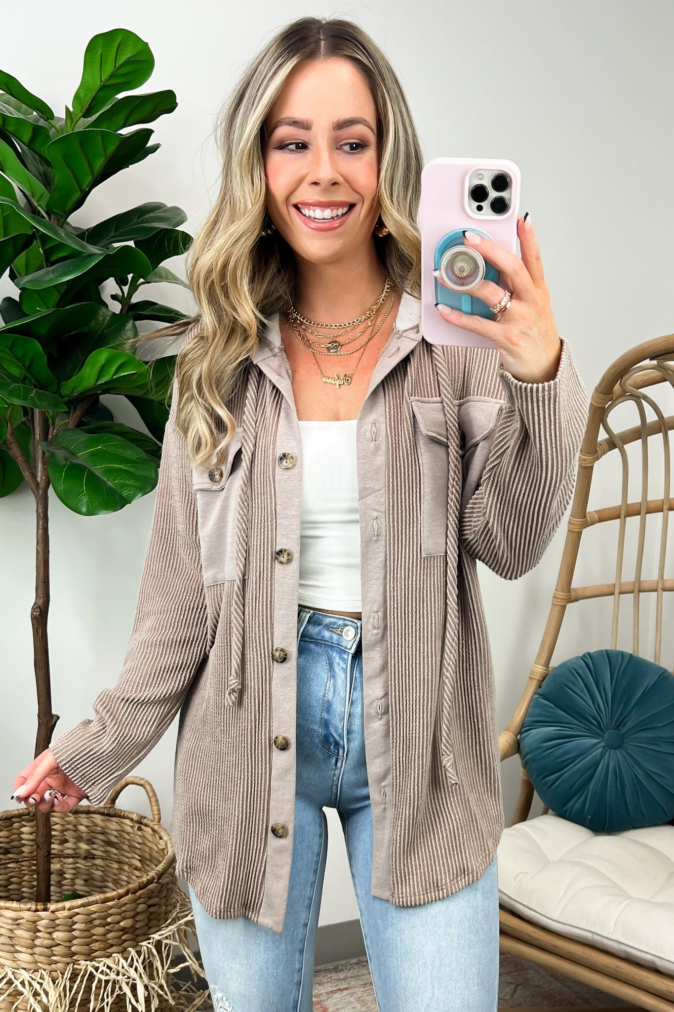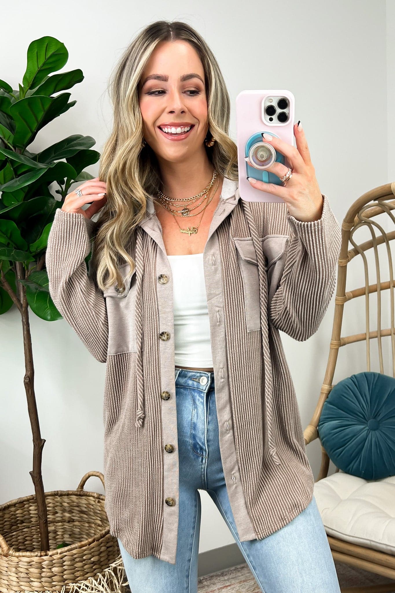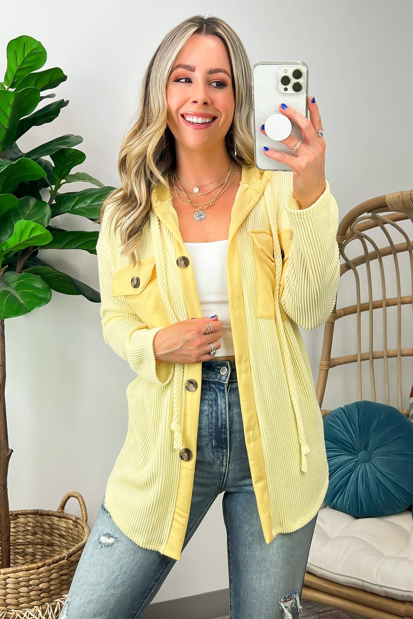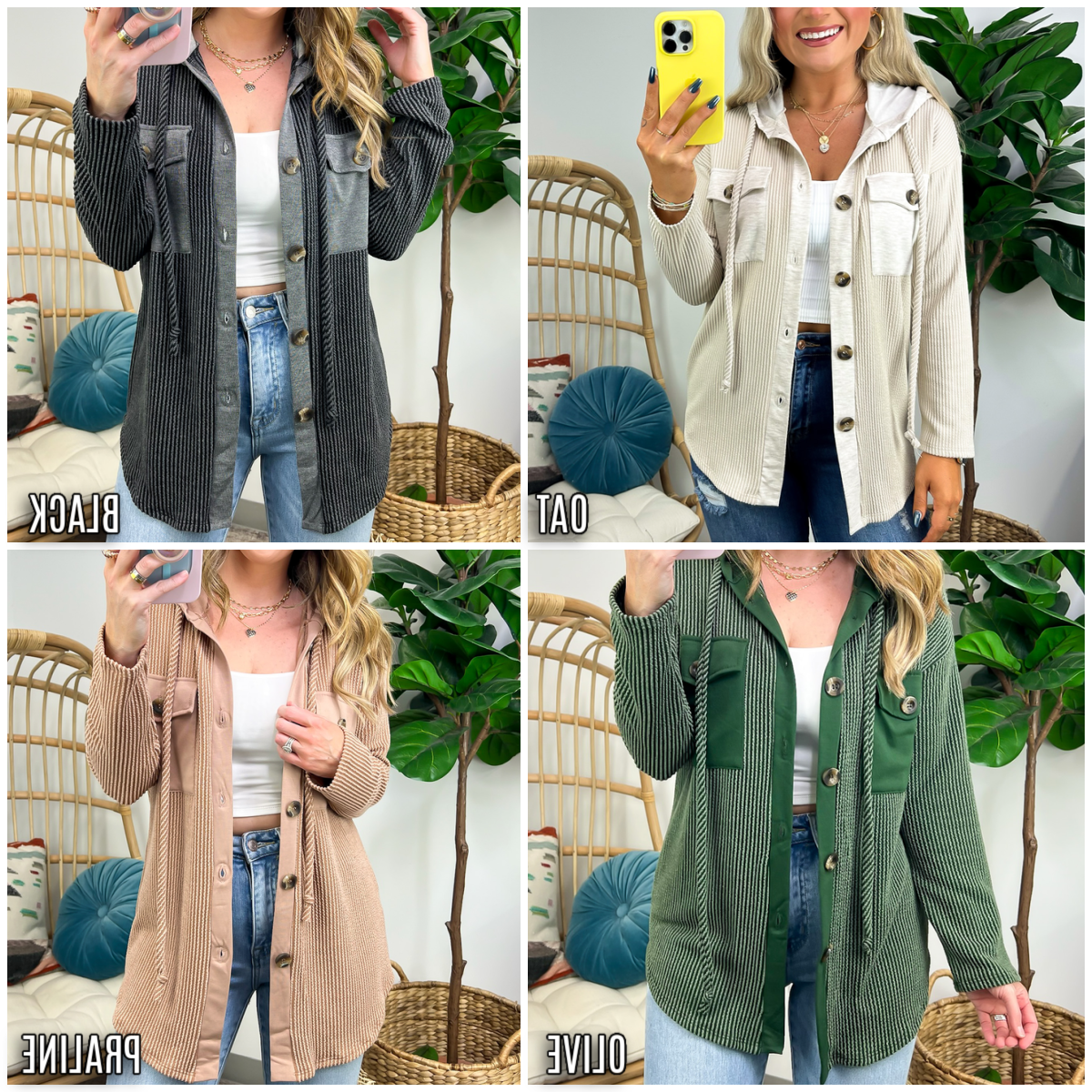 Details: Don't let the chill take away your style! Look cool and stay warm with this Ribbed Button Down Hooded Top. This cozy top is perfect for fall and winter days, with ribbed detail and a hood for extra comfort. Plus, you get the classic button down silhouette with a unique twist! Warm and stylish? What more could you ask for?