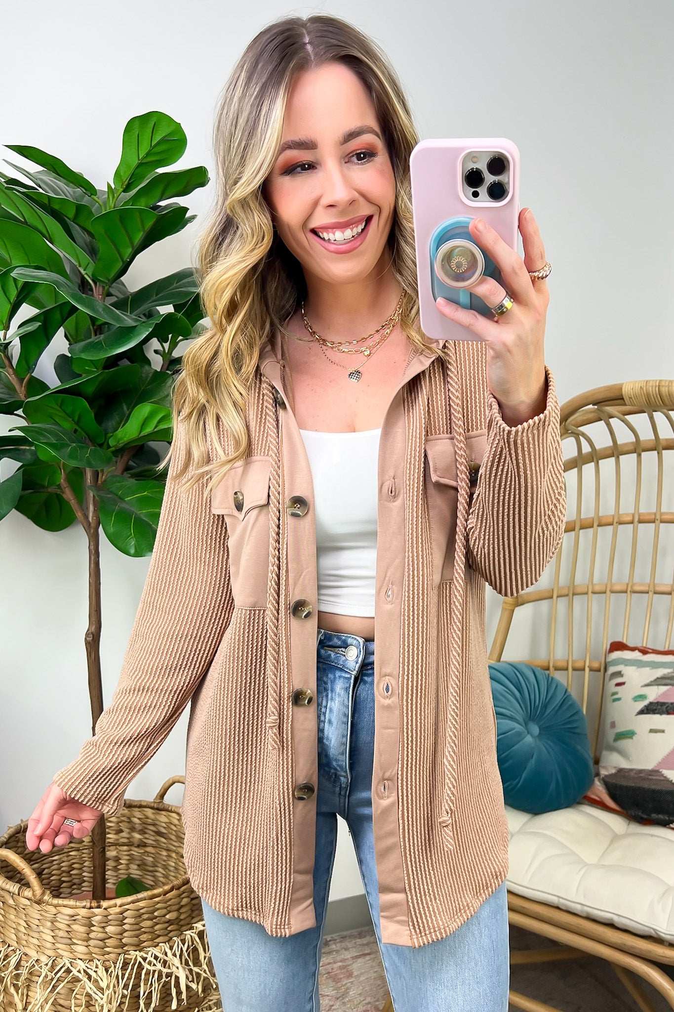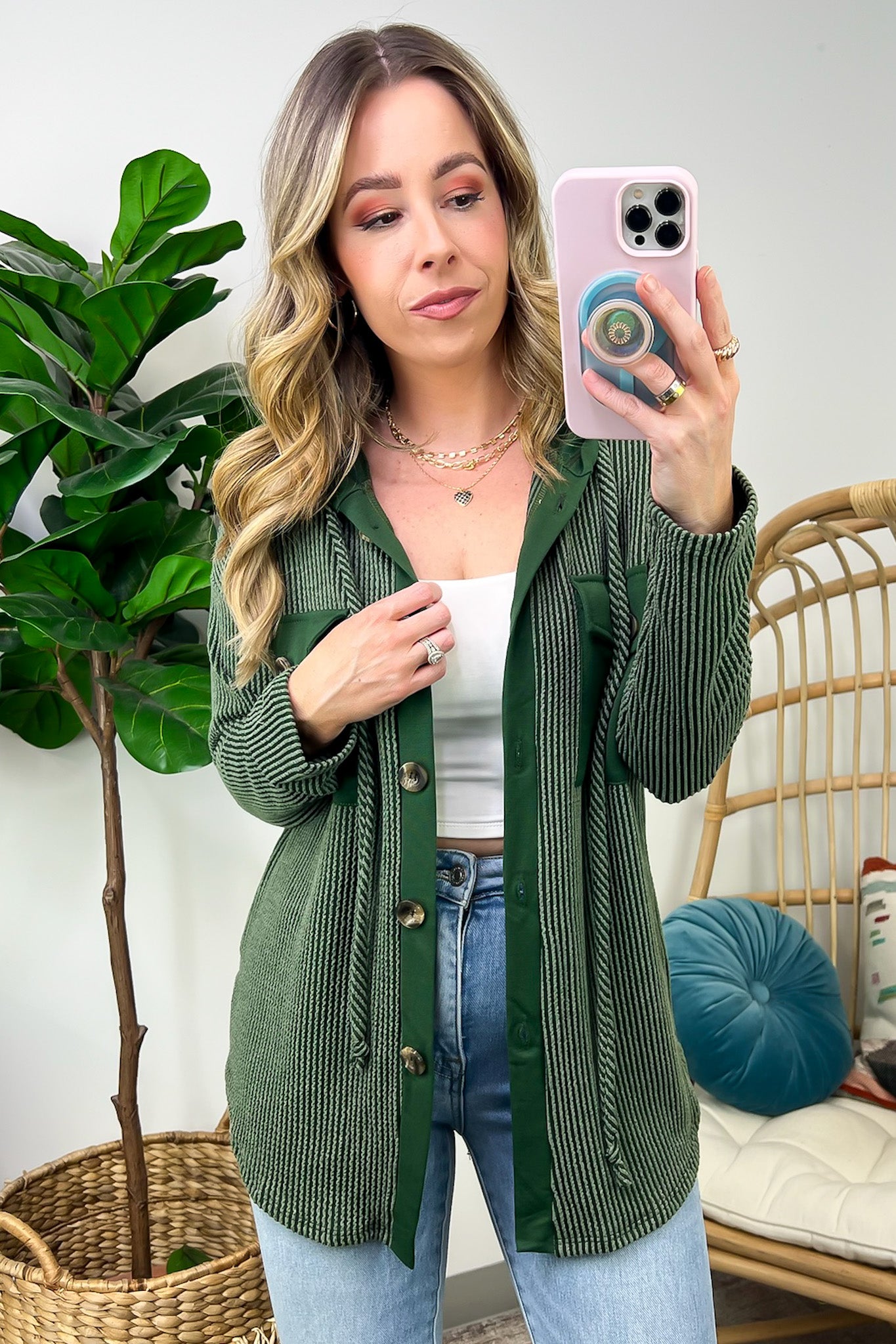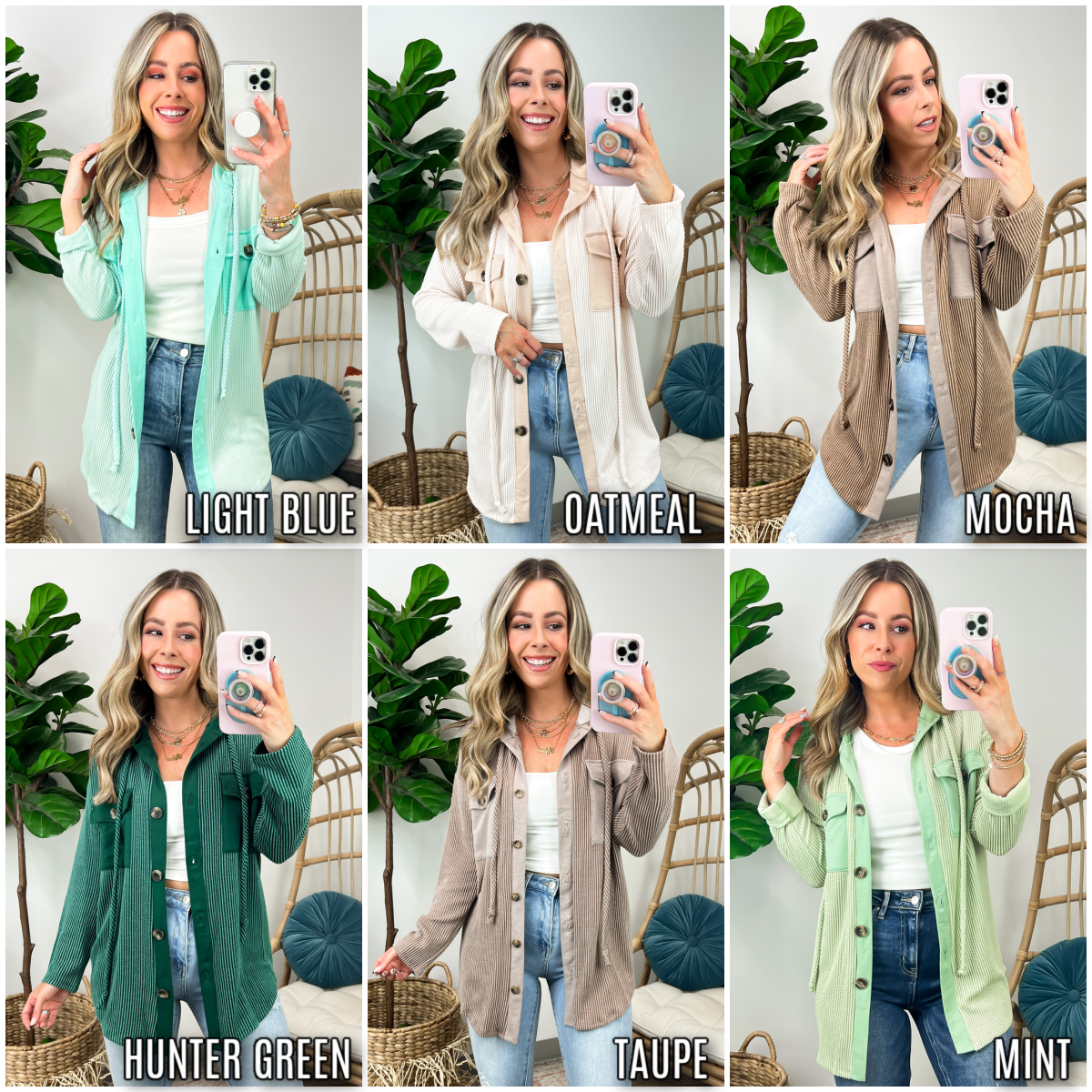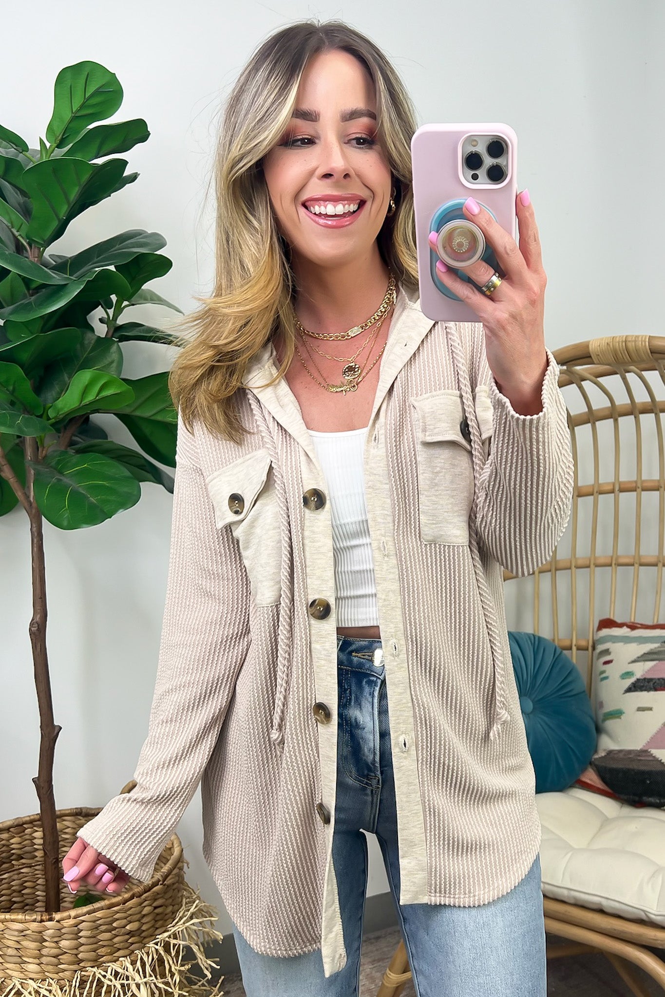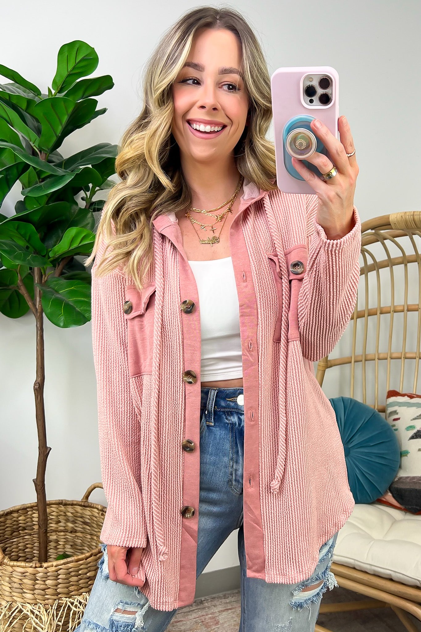 Details: Don't let the chill take away your style! Look cool and stay warm with this Ribbed Button Down Hooded Top. This cozy top is perfect for fall and winter days, with ribbed detail and a hood for extra comfort. Plus, you get the classic button down silhouette with a unique twist! Warm and stylish? What more could you ask for?