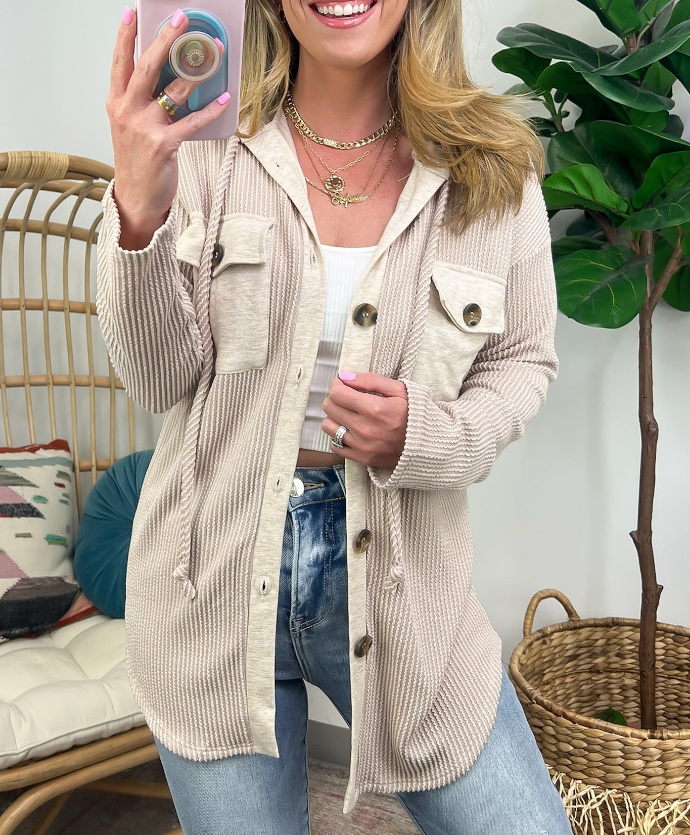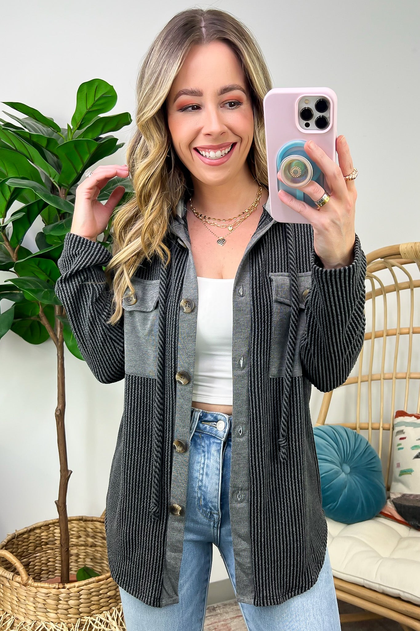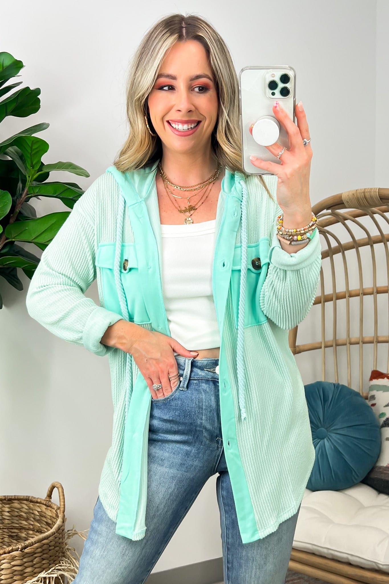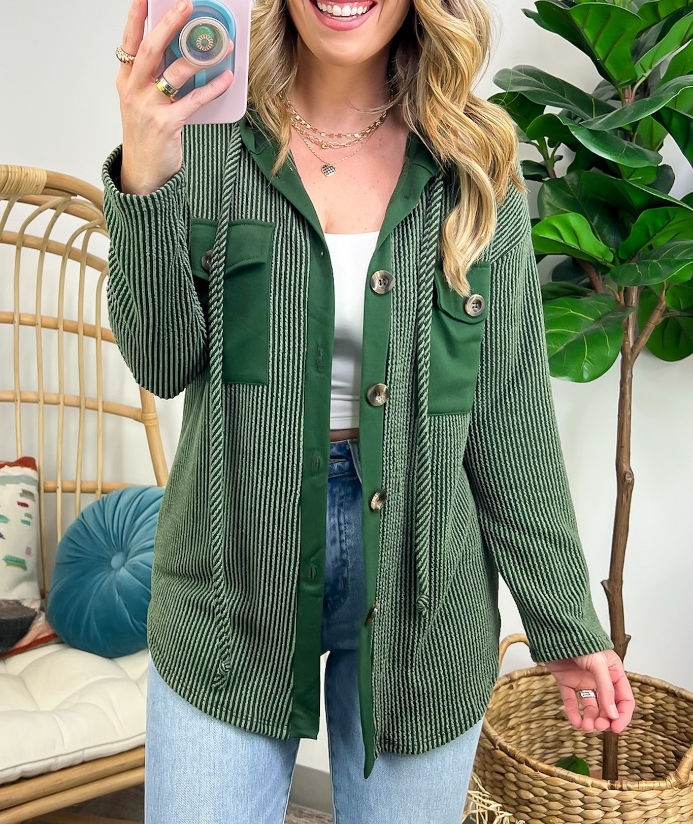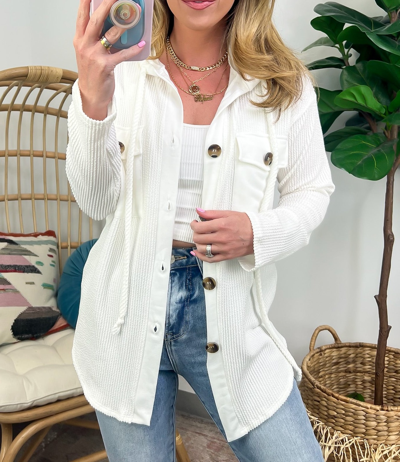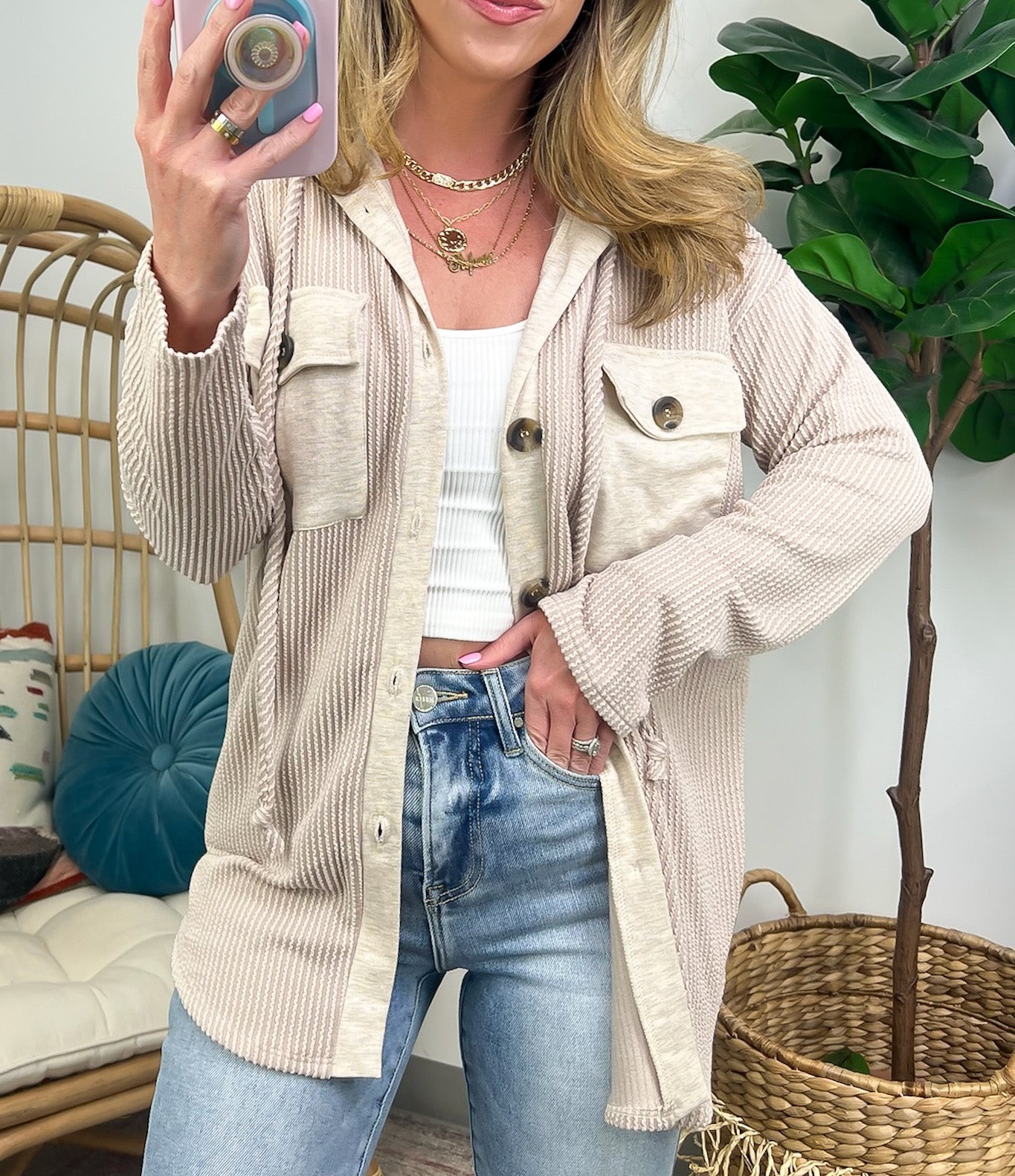 Details: Don't let the chill take away your style! Look cool and stay warm with this Ribbed Button Down Hooded Top. This cozy top is perfect for fall and winter days, with ribbed detail and a hood for extra comfort. Plus, you get the classic button down silhouette with a unique twist! Warm and stylish? What more could you ask for?