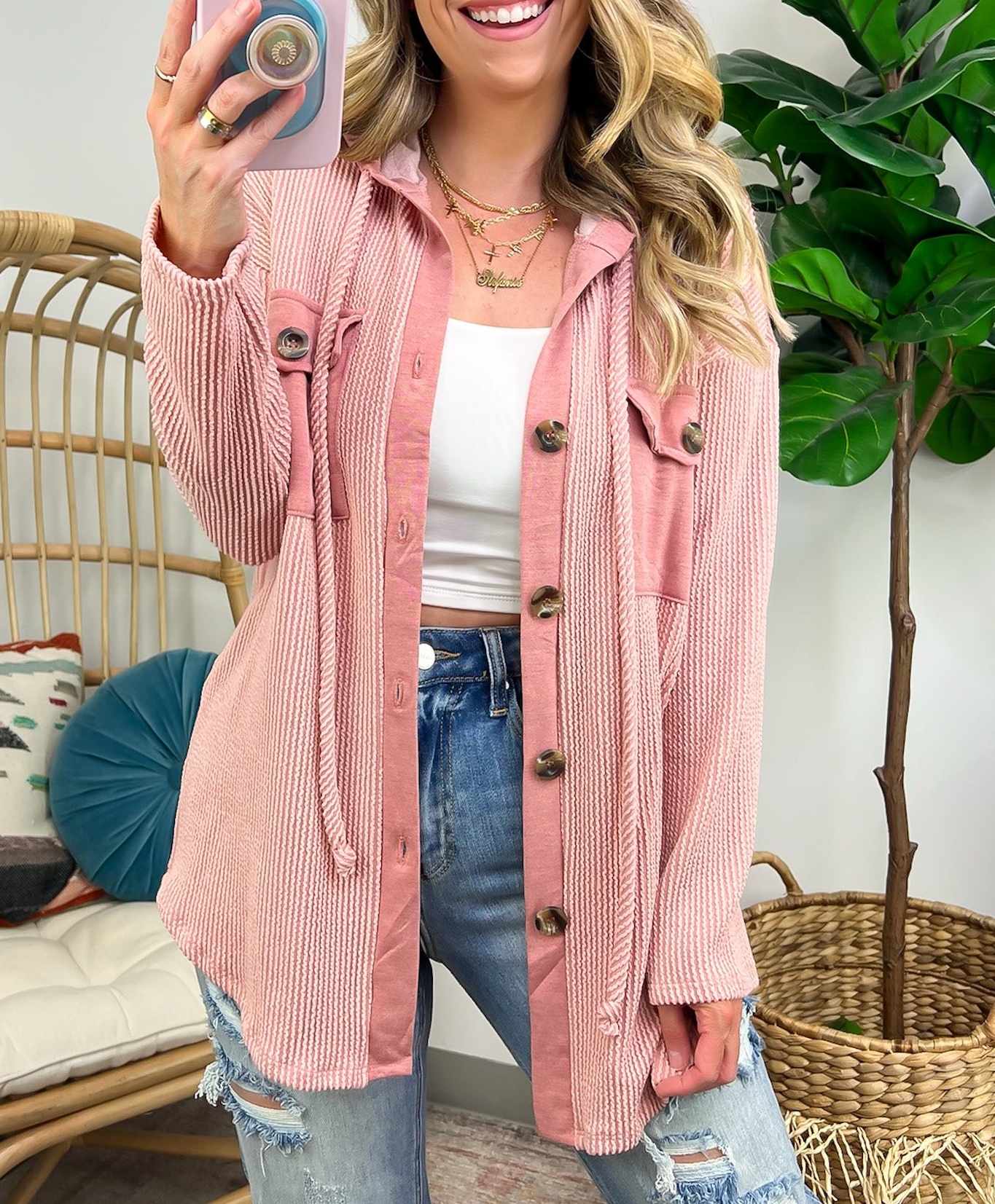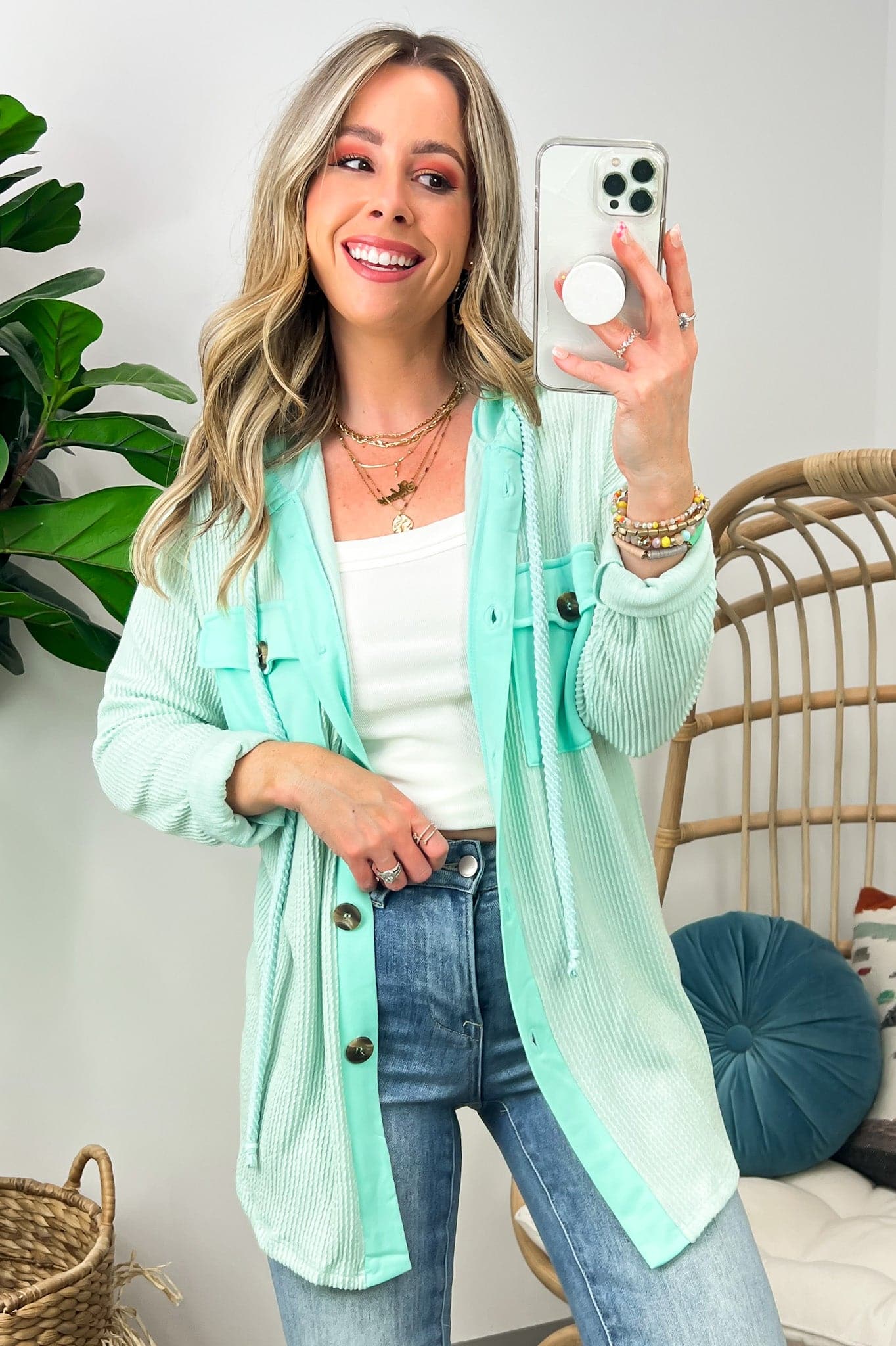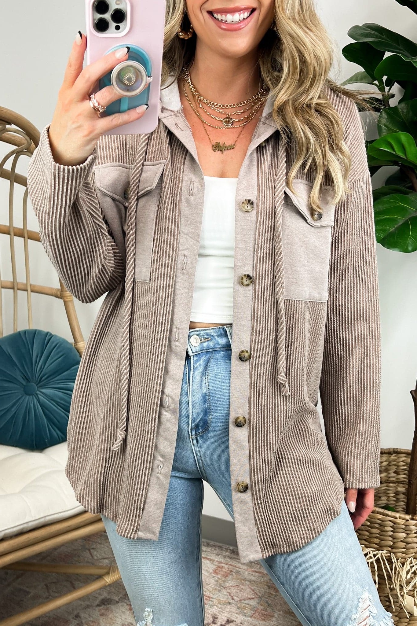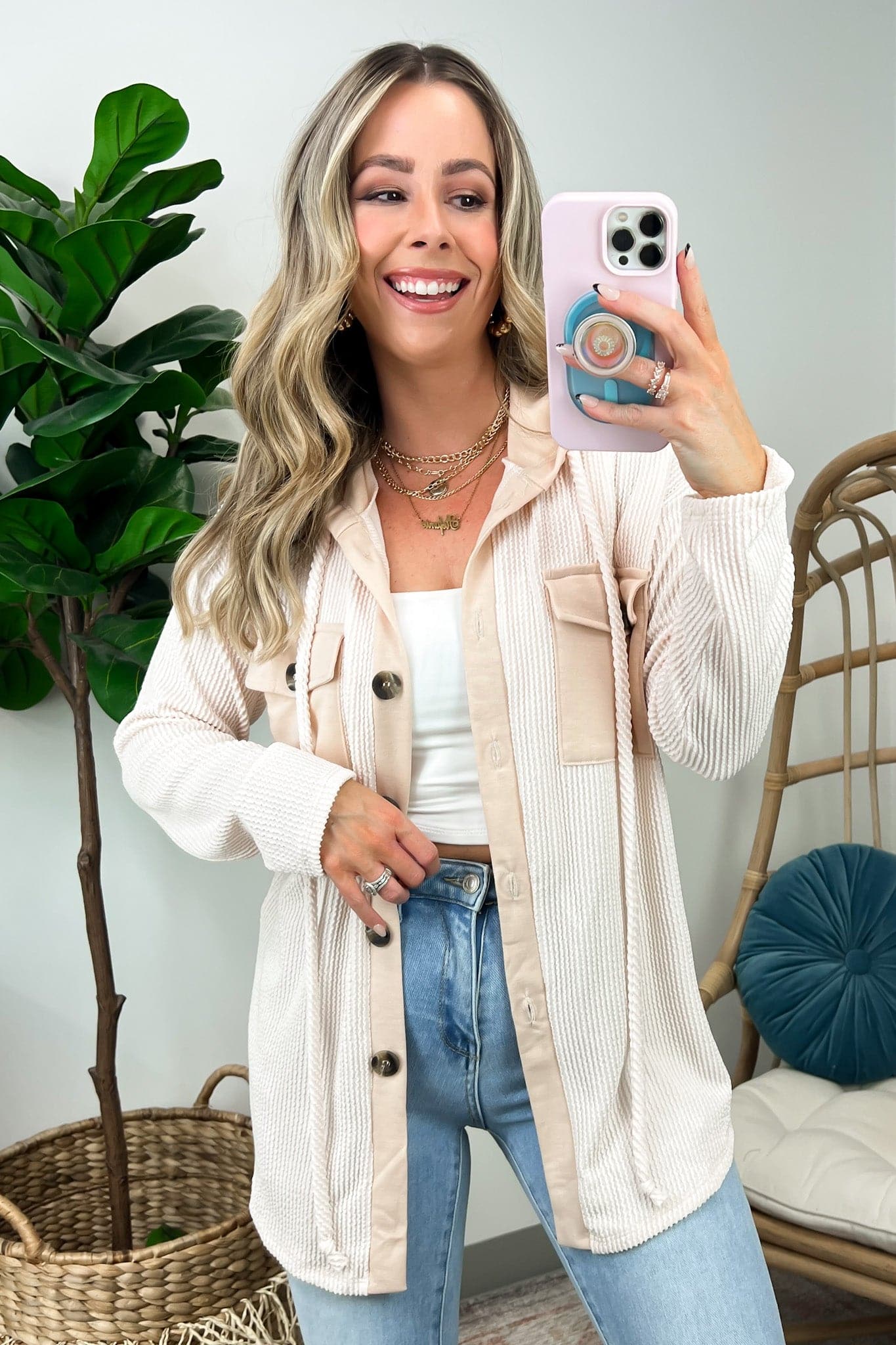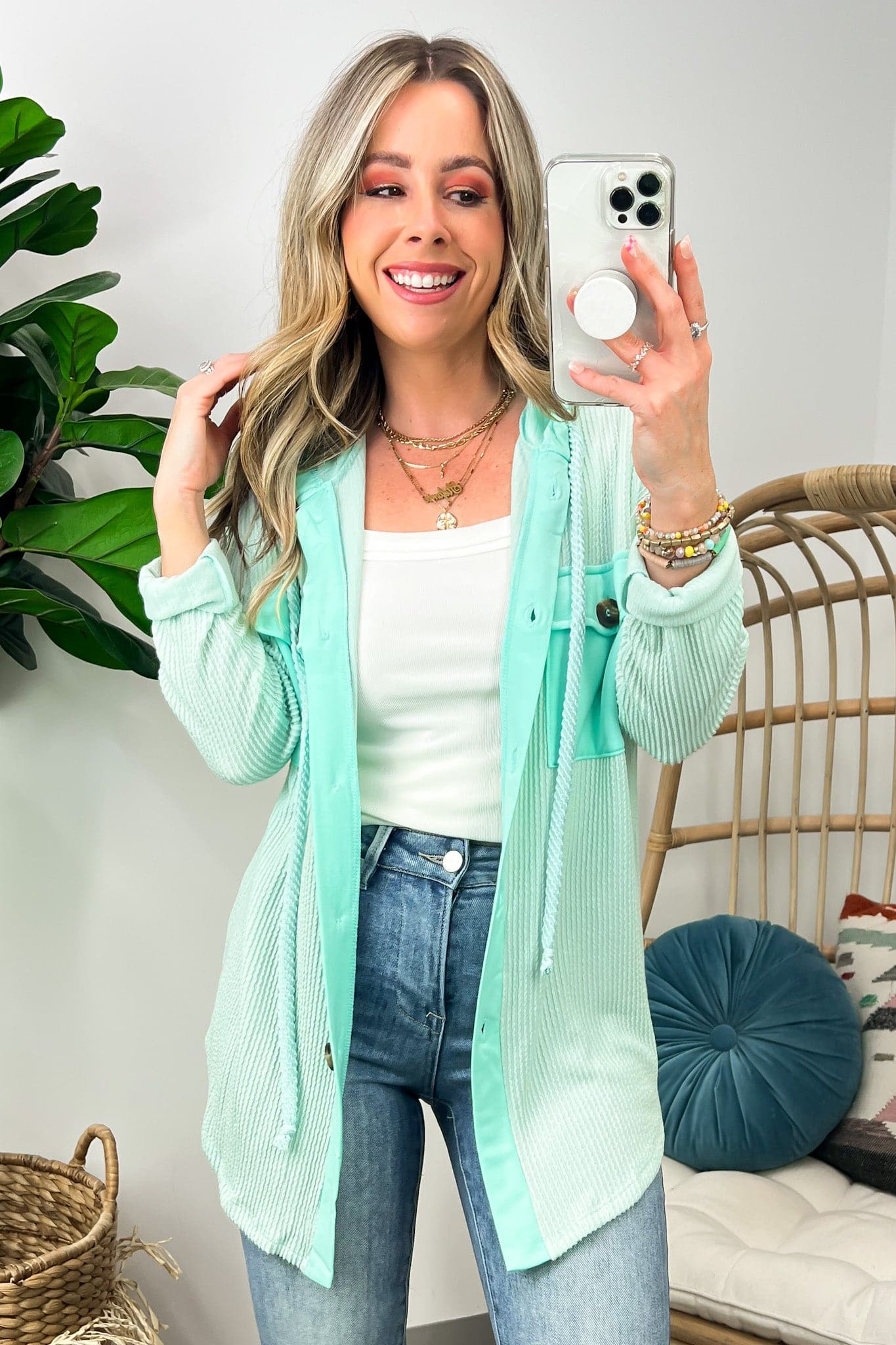 Details: Don't let the chill take away your style! Look cool and stay warm with this Ribbed Button Down Hooded Top. This cozy top is perfect for fall and winter days, with ribbed detail and a hood for extra comfort. Plus, you get the classic button down silhouette with a unique twist! Warm and stylish? What more could you ask for?