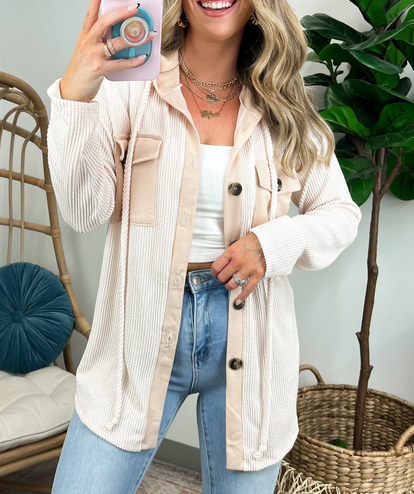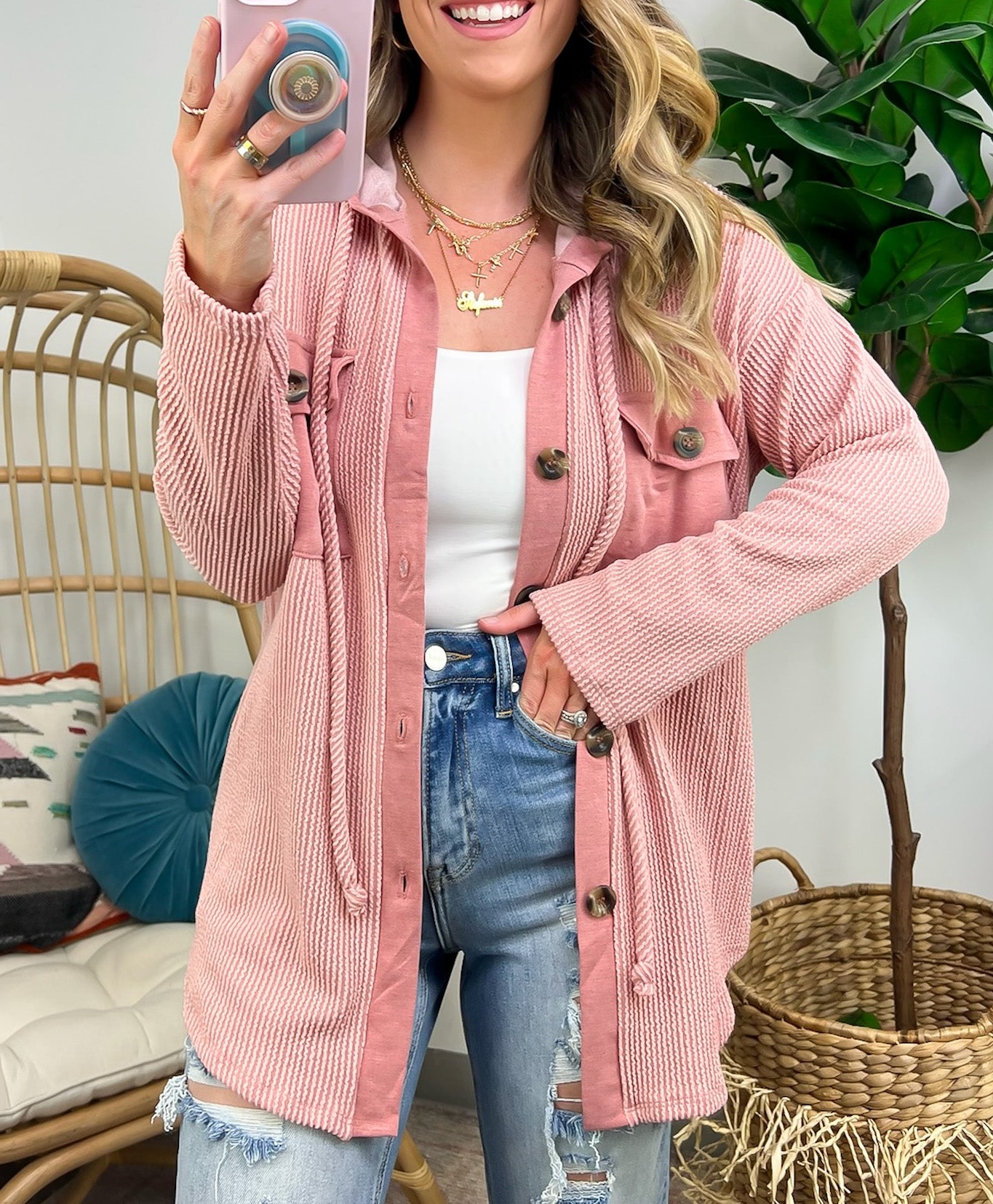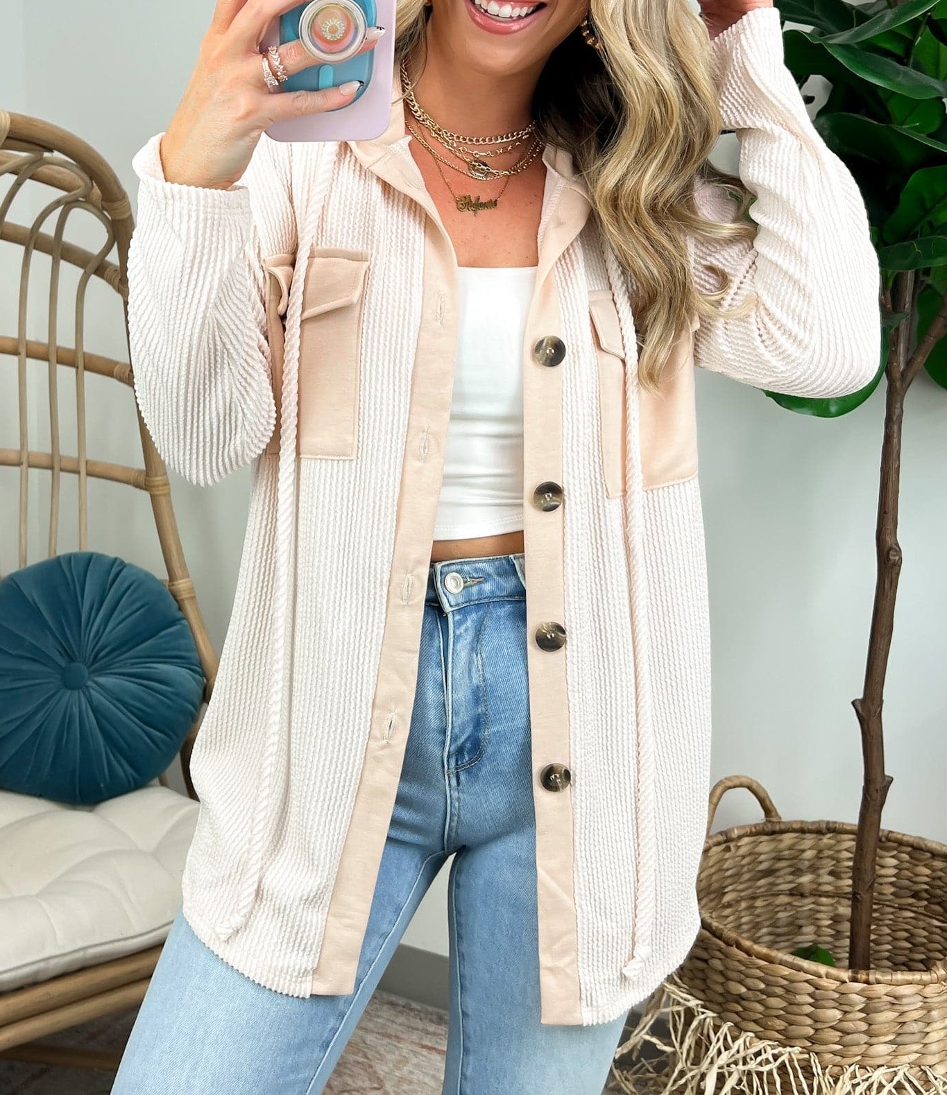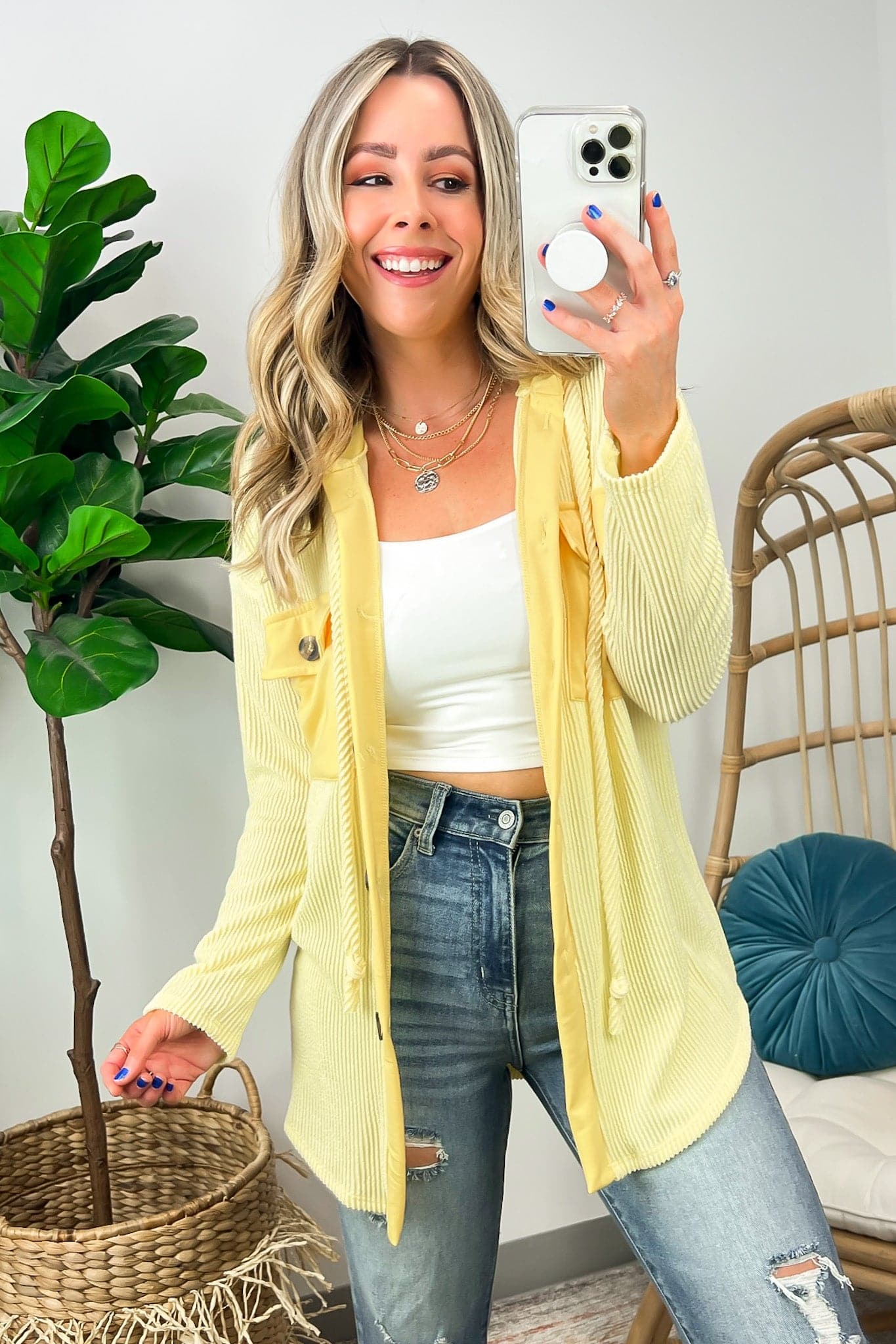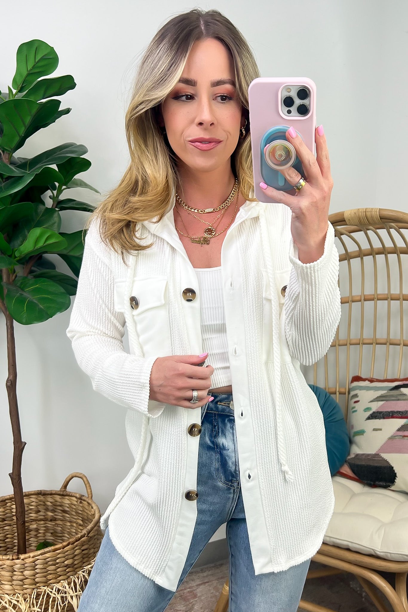 Details: Don't let the chill take away your style! Look cool and stay warm with this Ribbed Button Down Hooded Top. This cozy top is perfect for fall and winter days, with ribbed detail and a hood for extra comfort. Plus, you get the classic button down silhouette with a unique twist! Warm and stylish? What more could you ask for?