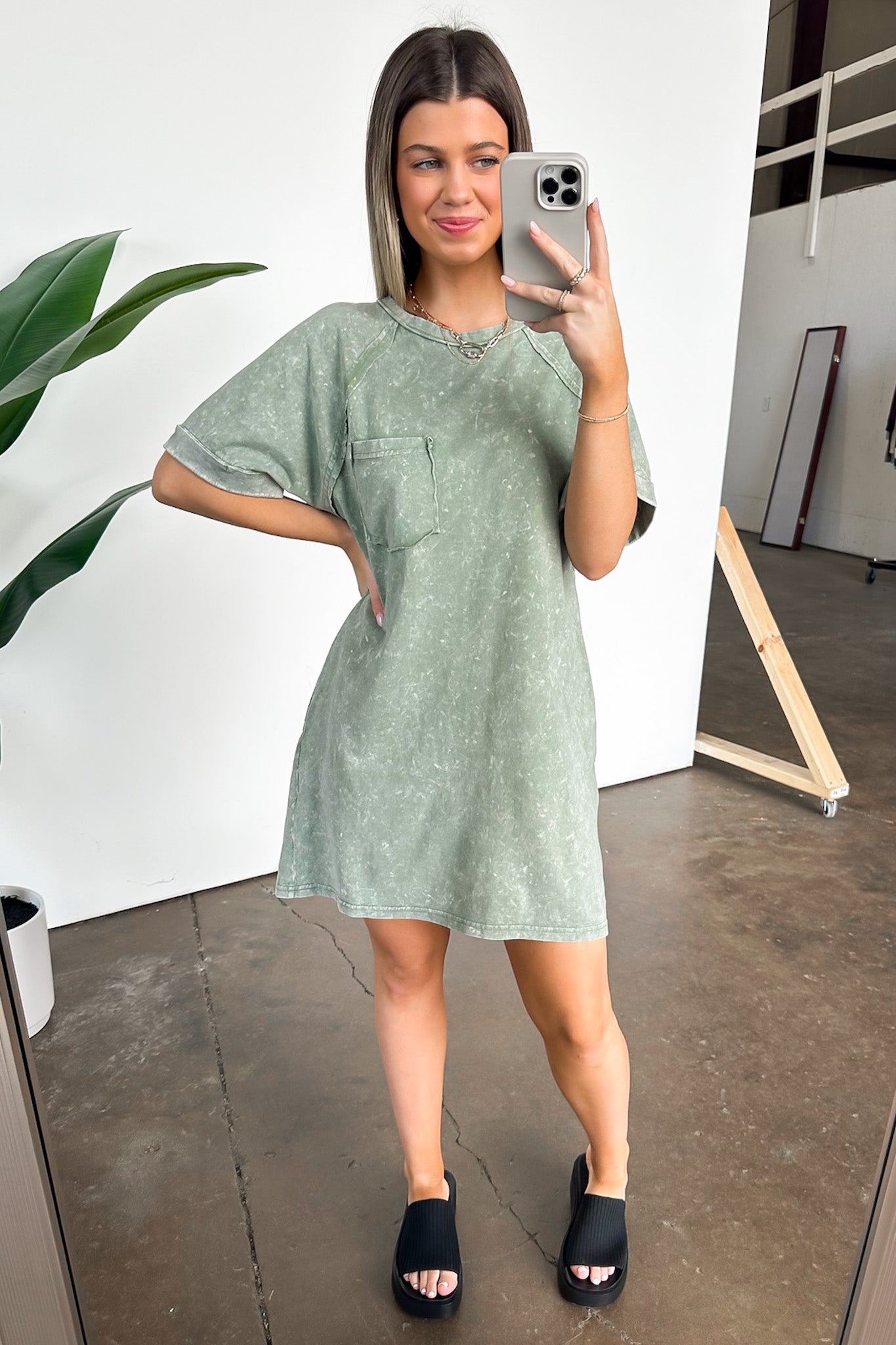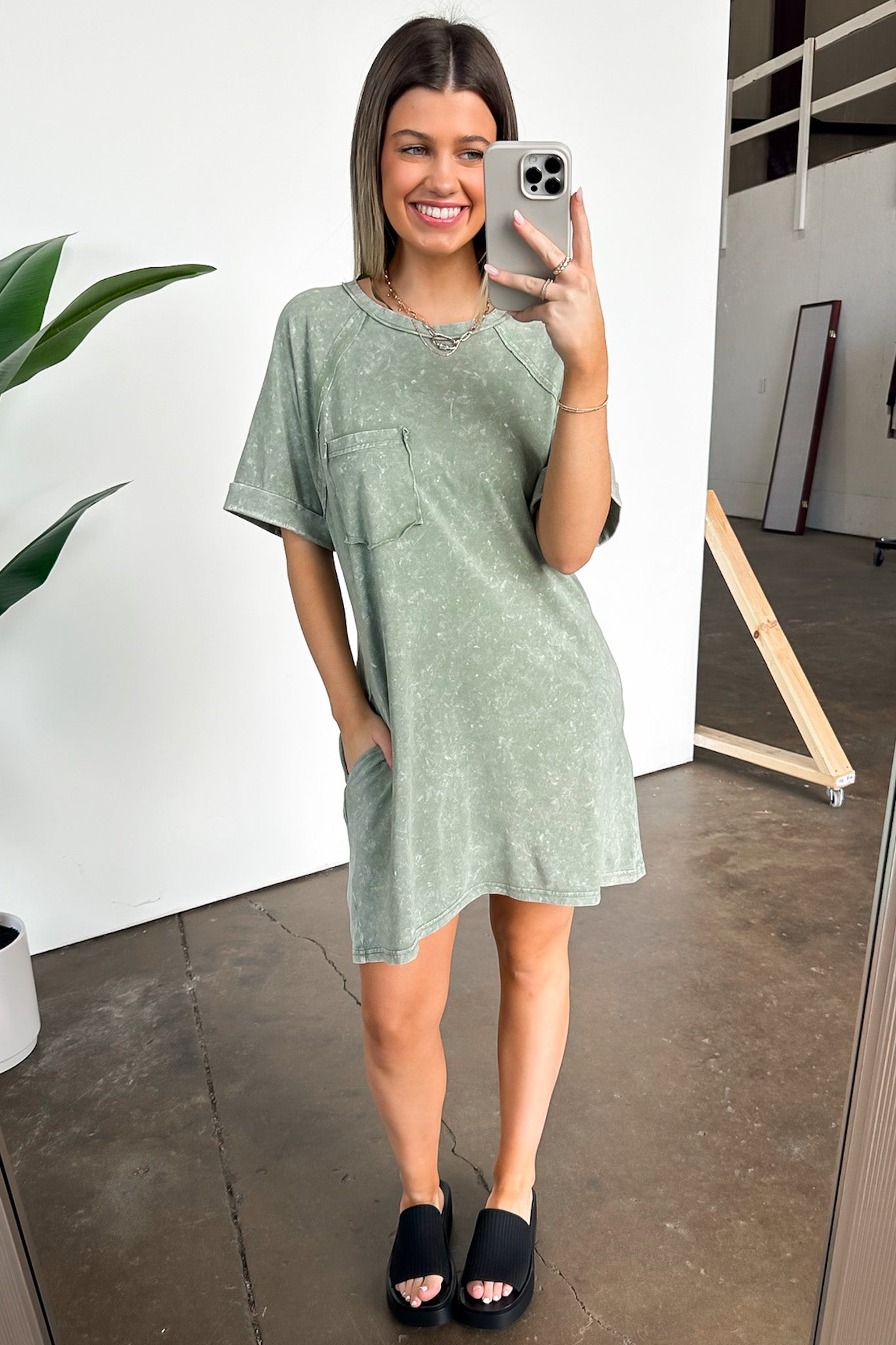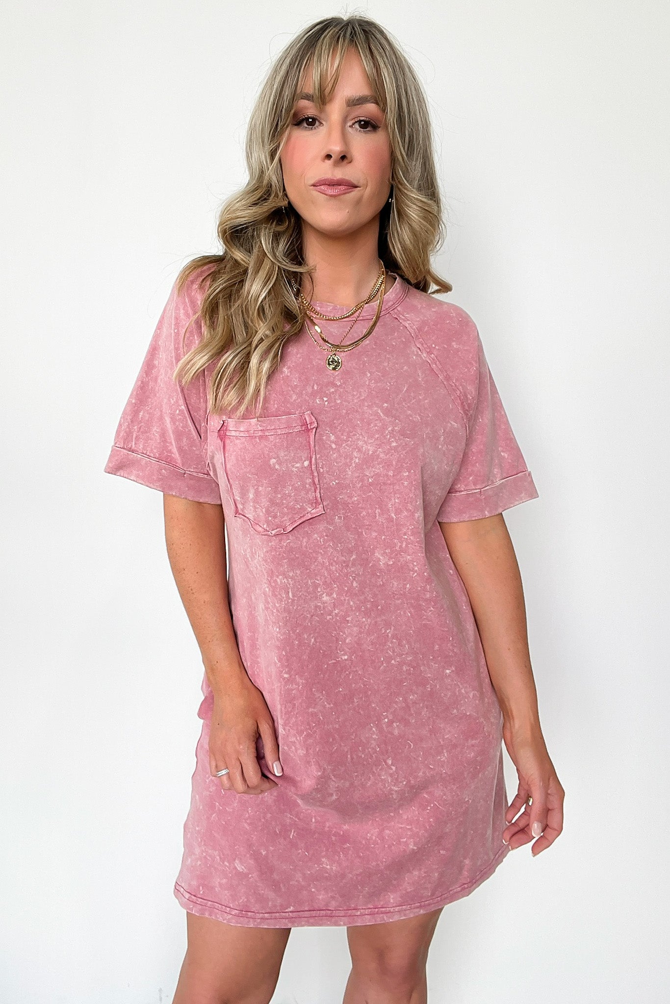 Details: Get ready to rock this Short Sleeve Pocket T-Shirt Dress! Featuring a round neck, oversized fit, and washed knit fabric, this mini dress is perfect for a casual yet stylish look. The drop shoulder and short raglan sleeves add a unique touch to this dress. Embrace comfort and fashion with this dress!