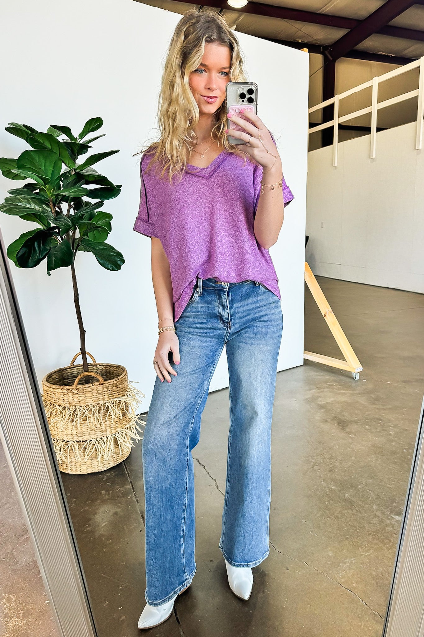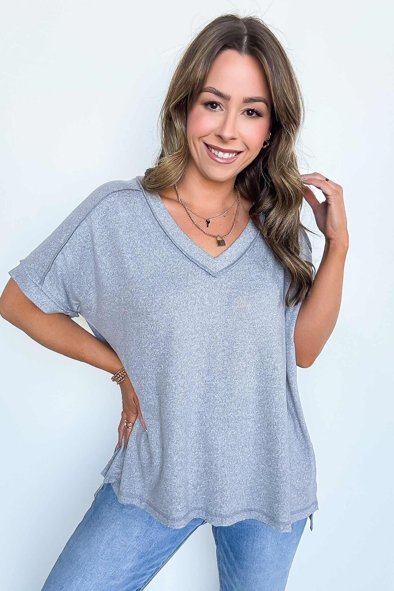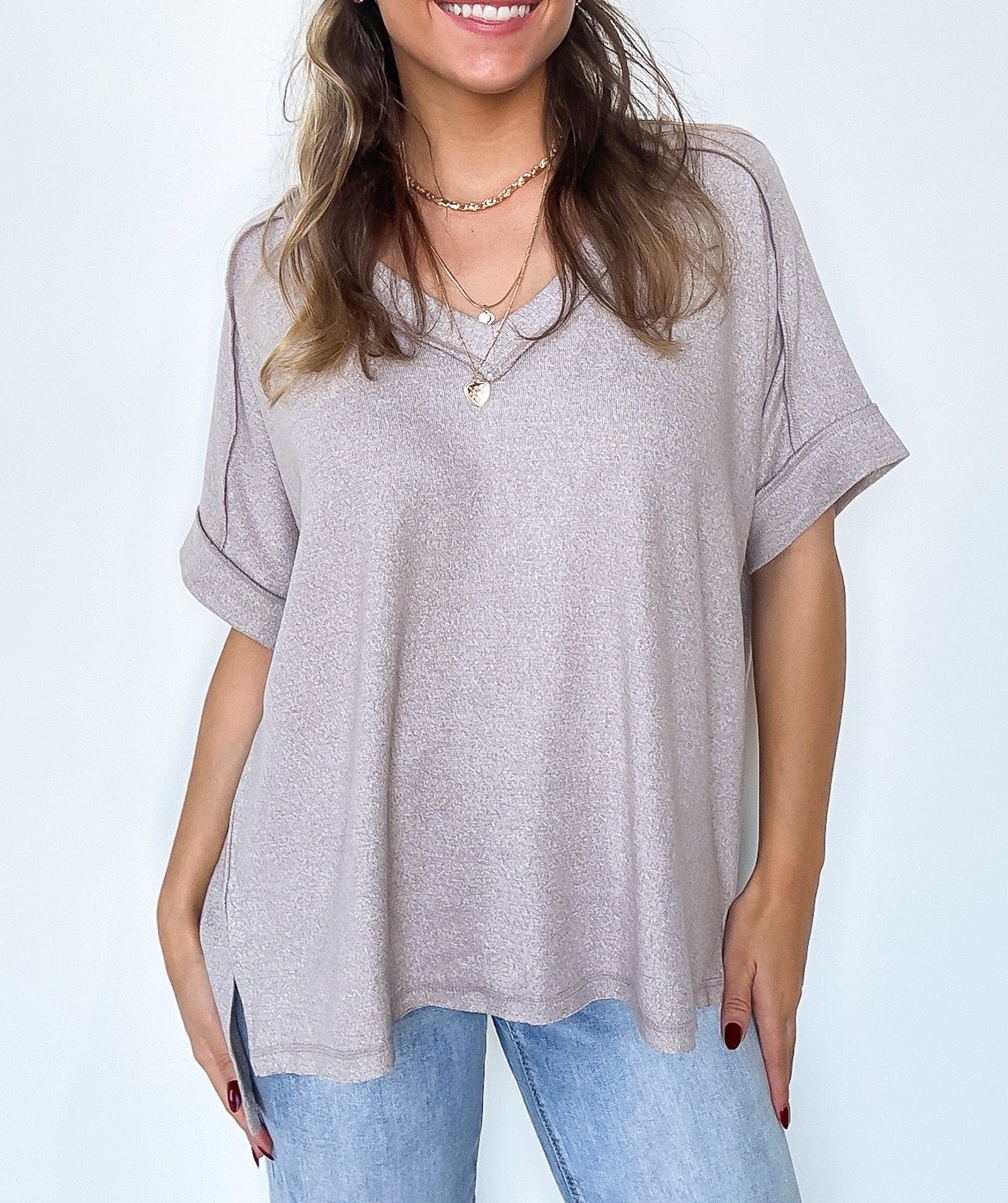 Details: Get cozy in our V-Neck Melange Knit Tee! With its soft and comfortable Hacci fabric, this tee features a stylish v-neck and folded sleeves. The hi-low hem and side slit add an edgy touch, while the exposed seams add a unique detail. Perfect for lounging or going out, this tee is sure to become a staple in your wardrobe.
