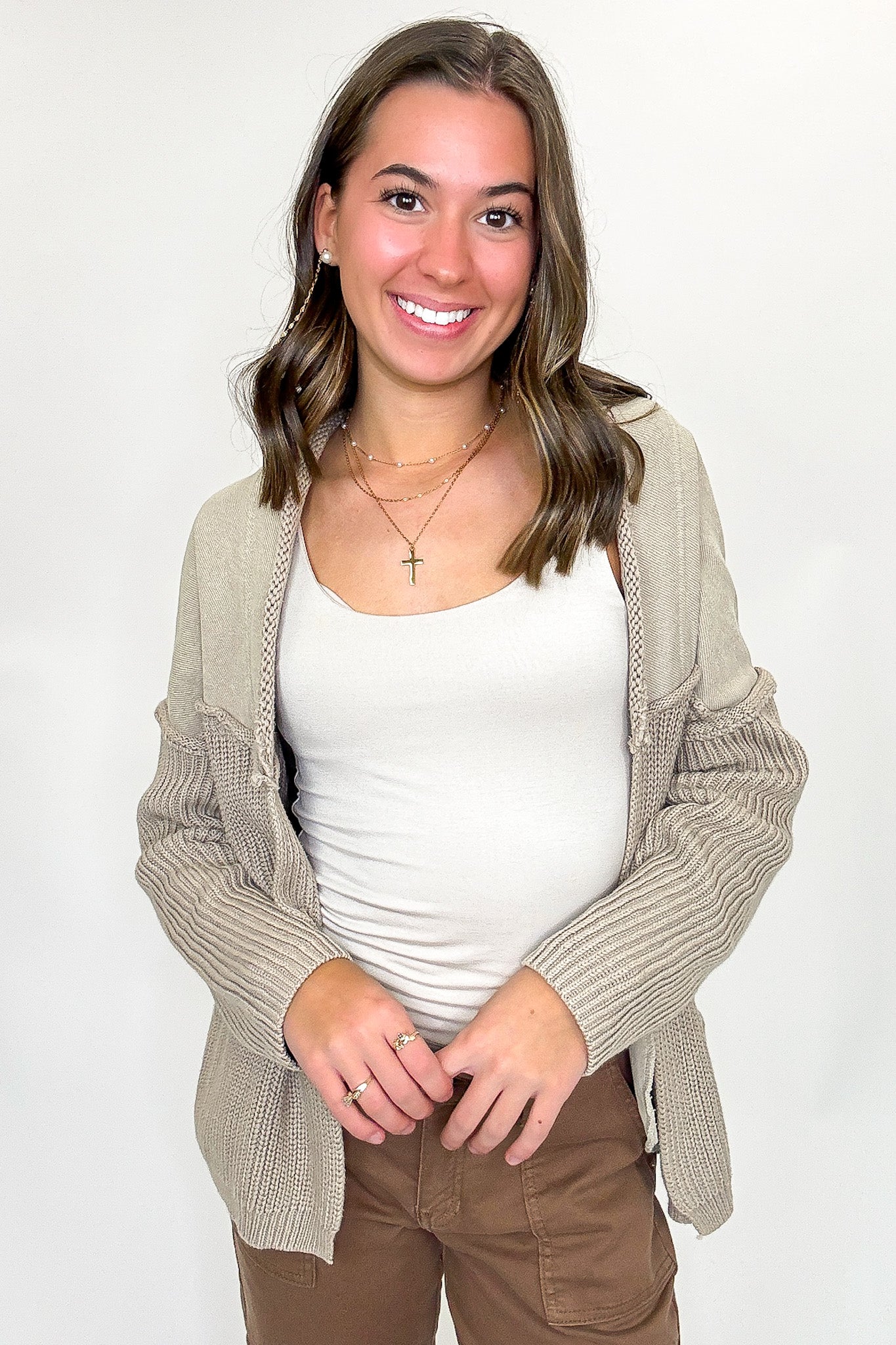 Details: Elevate your layers, where cozy knit meets modern contrast. Designed with a rich, textured feel and defined edges, this cardigan blends comfort and sophistication for a polished finish.