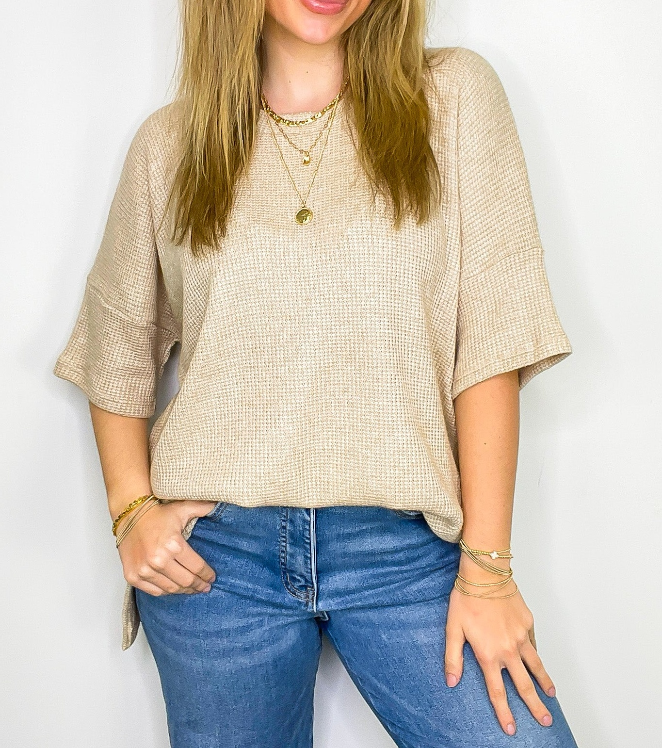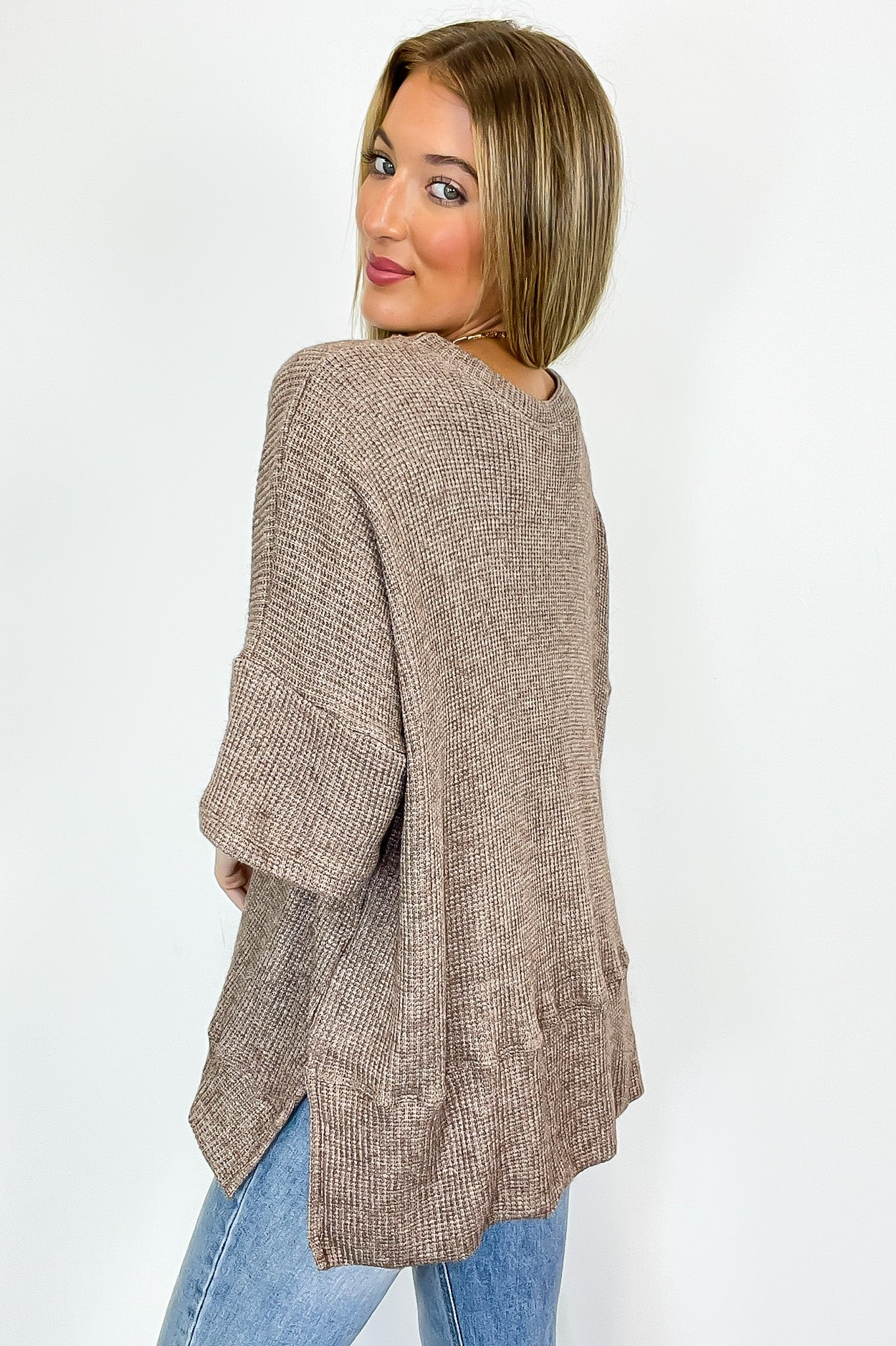 Details: Stay comfy and stylish with our Waffle Knit Oversized Top! This shirt features a trendy side slit and a cozy waffle knit, perfect for any casual look.